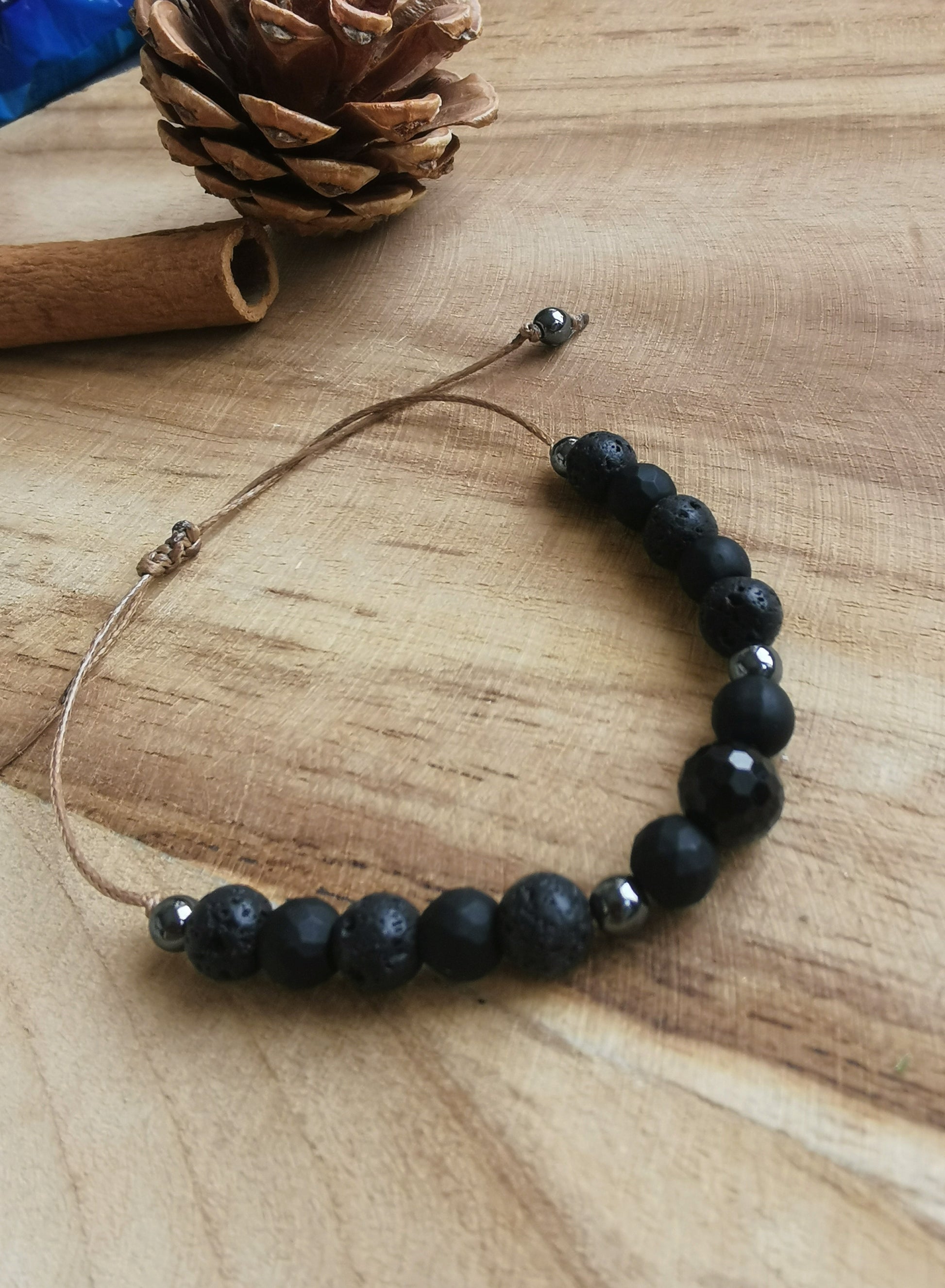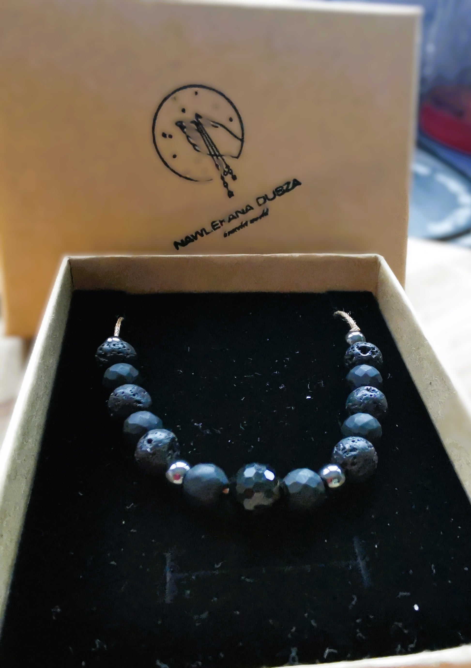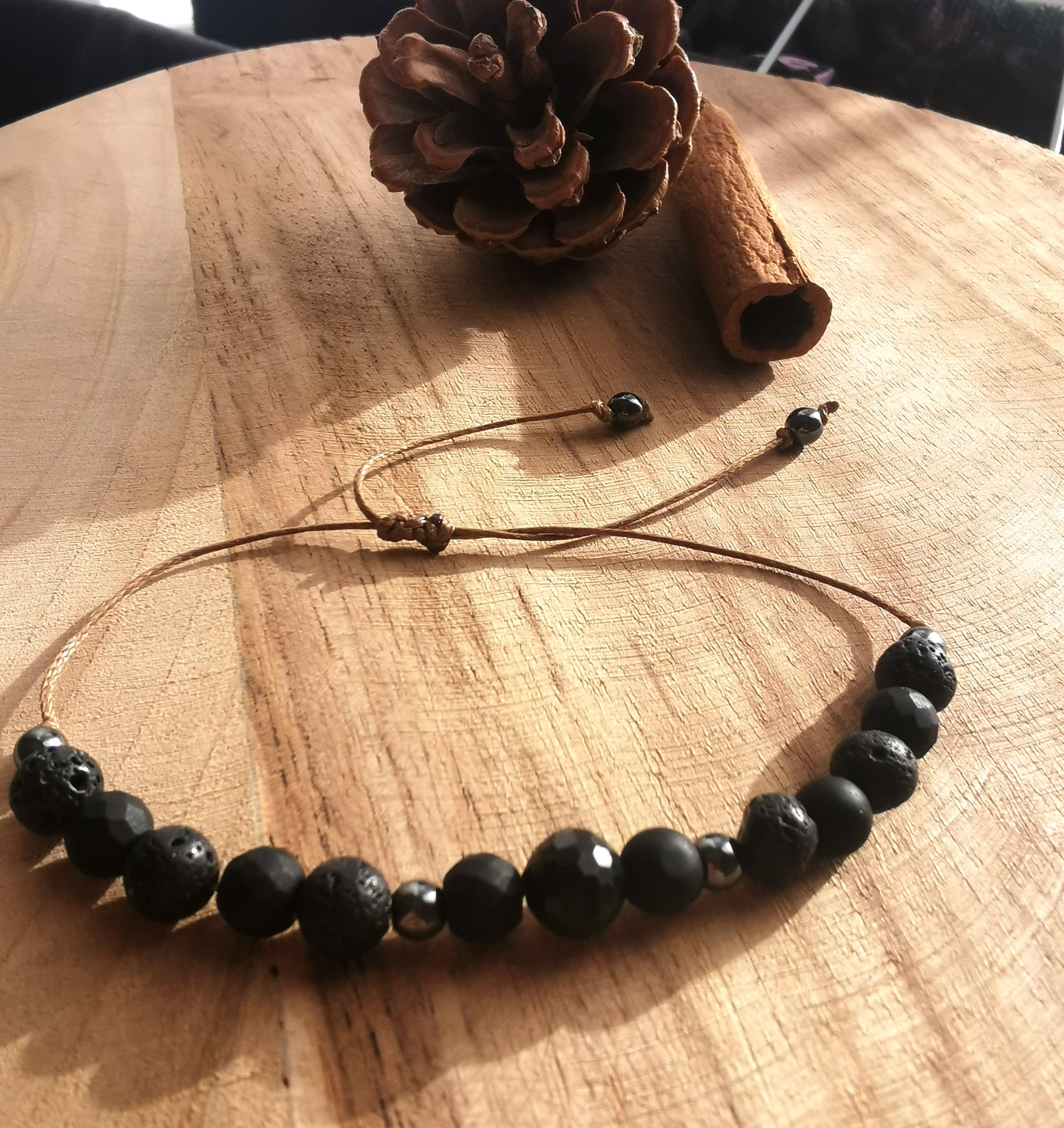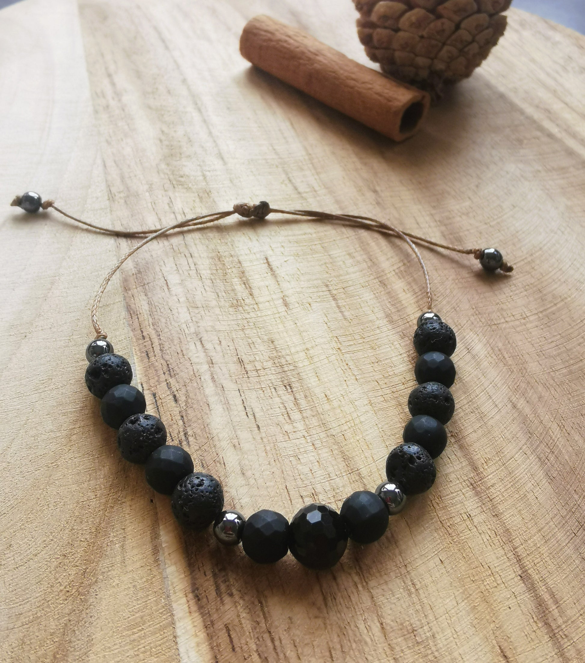 Ręcznie wykonana bransoletka na sznurku z naturalnych kamieni – turmalinu, onyksu i lawy wulkanicznej.