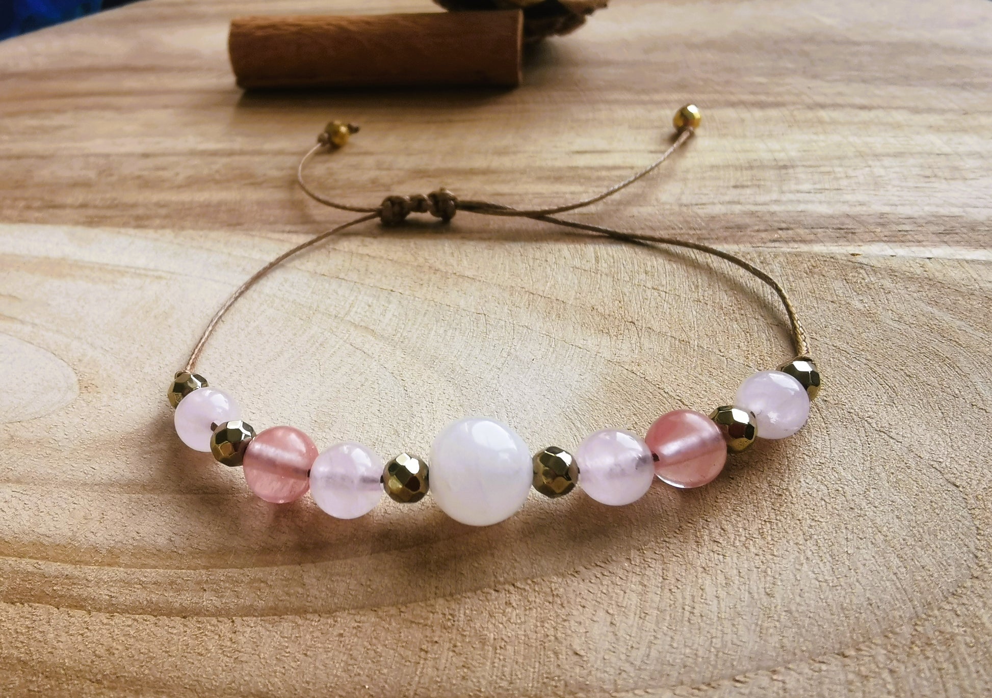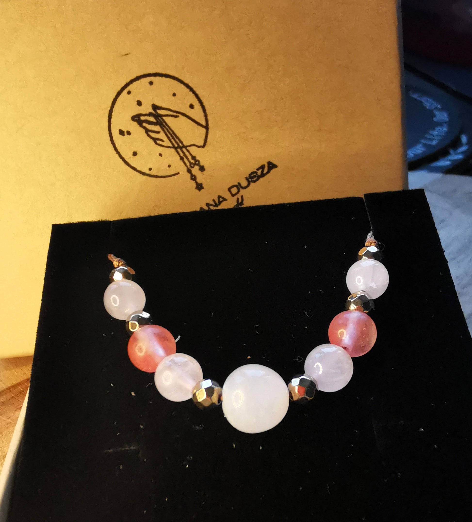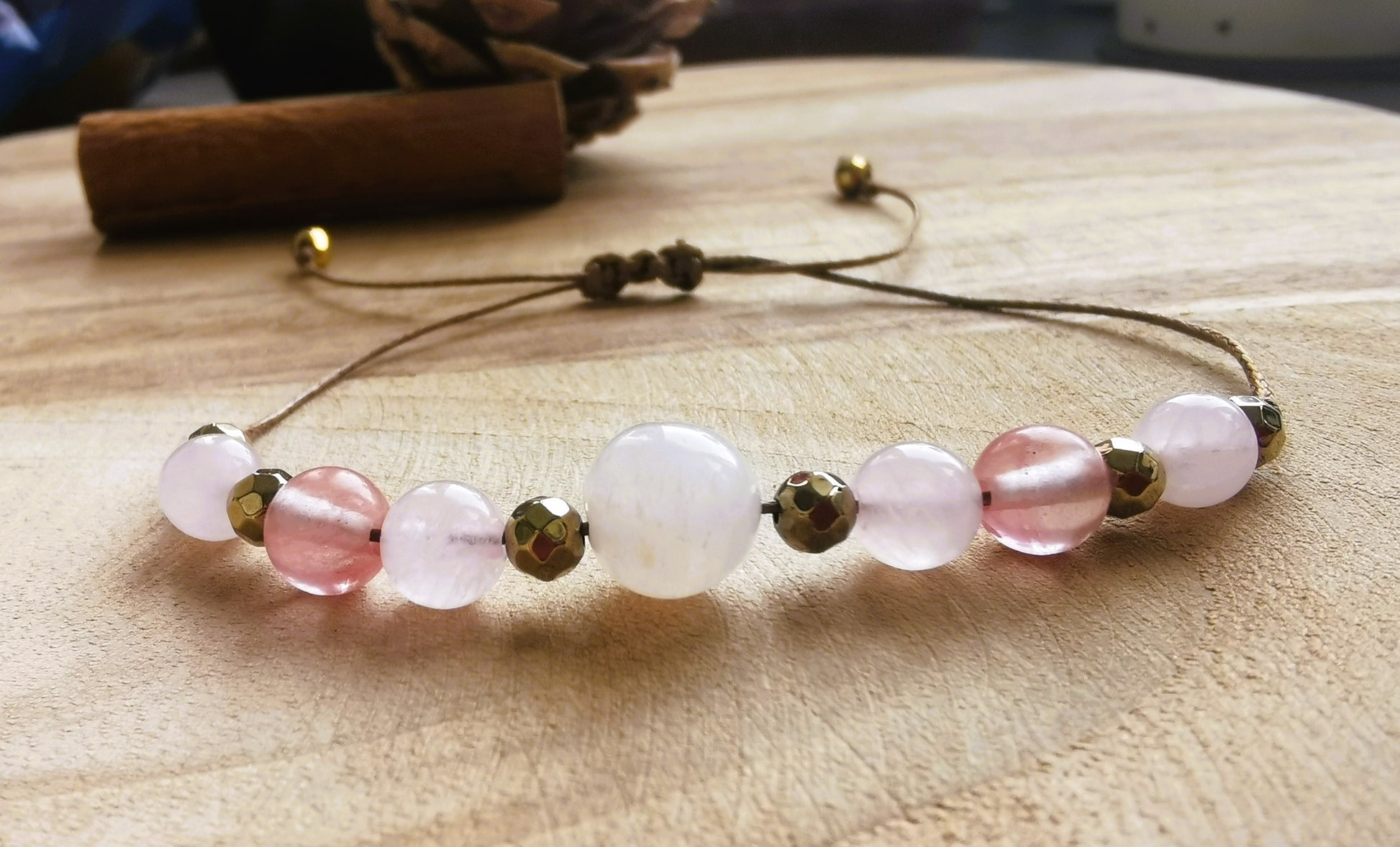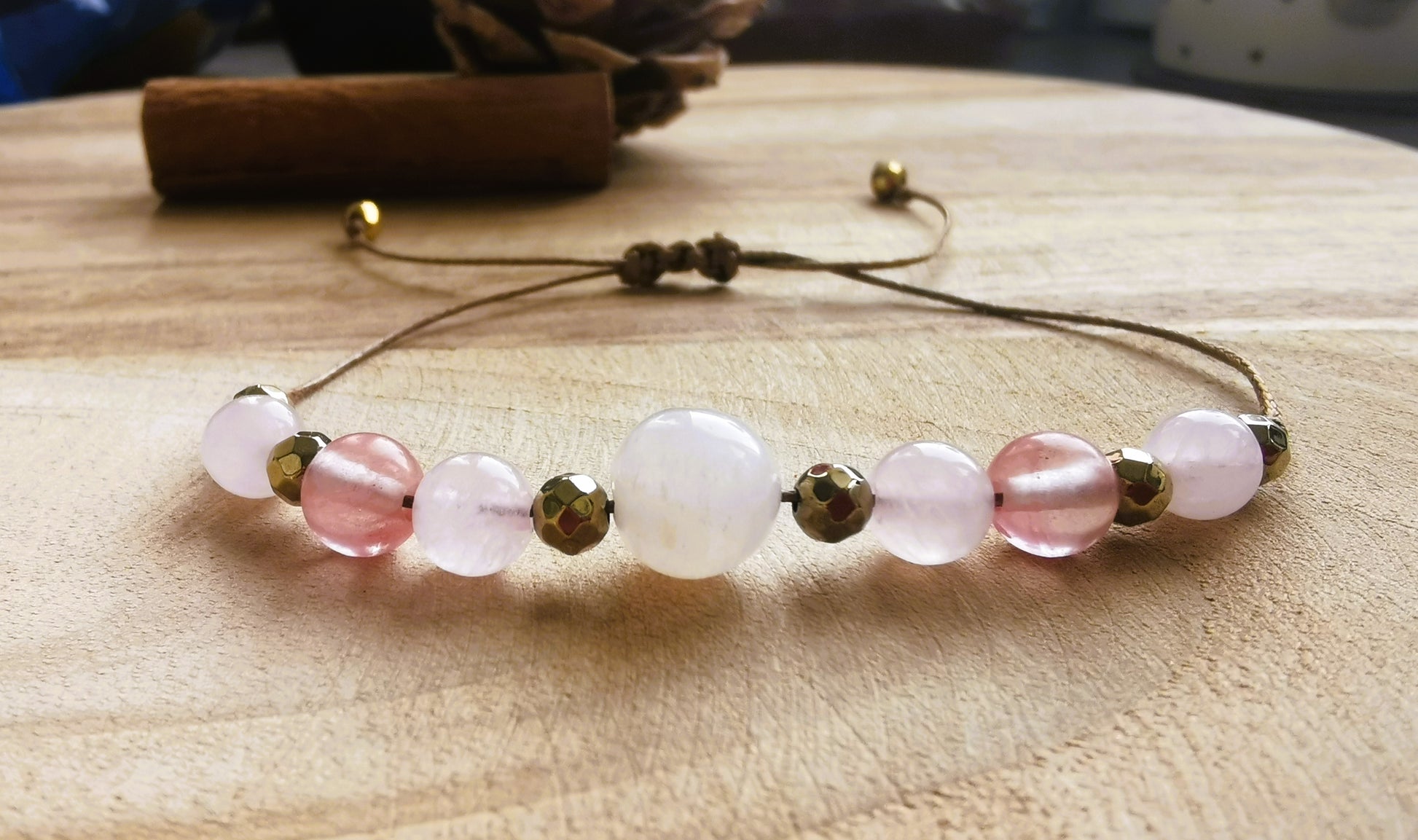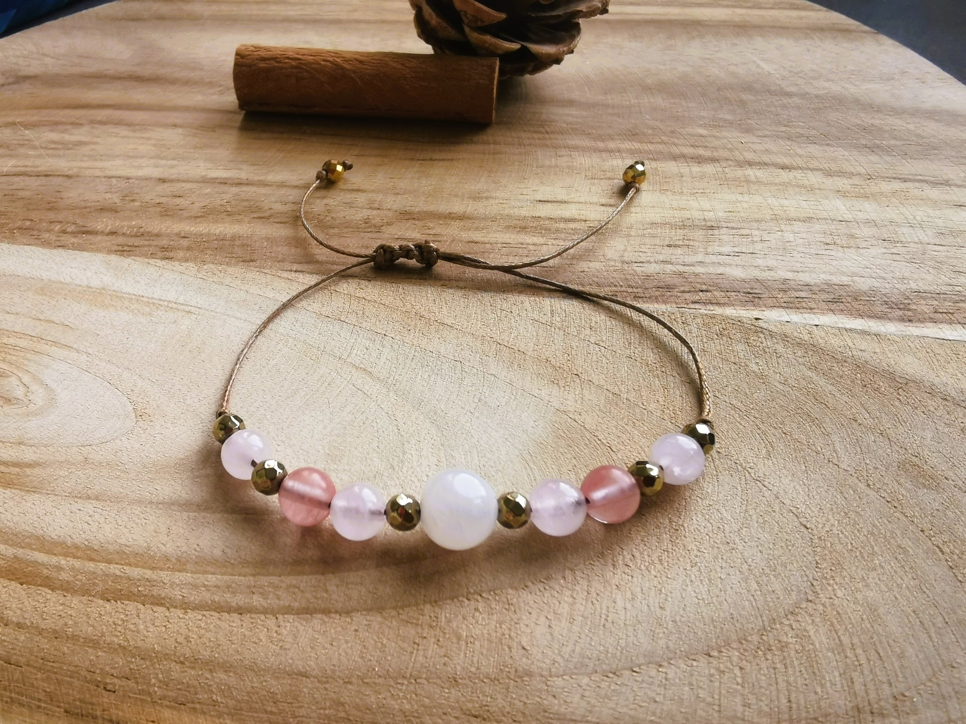 Subtelna, ręcznie wykonana bransoletka na sznurku, stworzona z naturalnych kamieni – różowego kwarcu, kryształu górskiego, kwarcu arbuzowego oraz pozłacanego hematytu, który dodaje jej ciepłego, złocistego blasku. To połączenie kamieni o łagodnej, harmonizującej energii, które wspierają miłość, spokój i wewnętrzne światło.