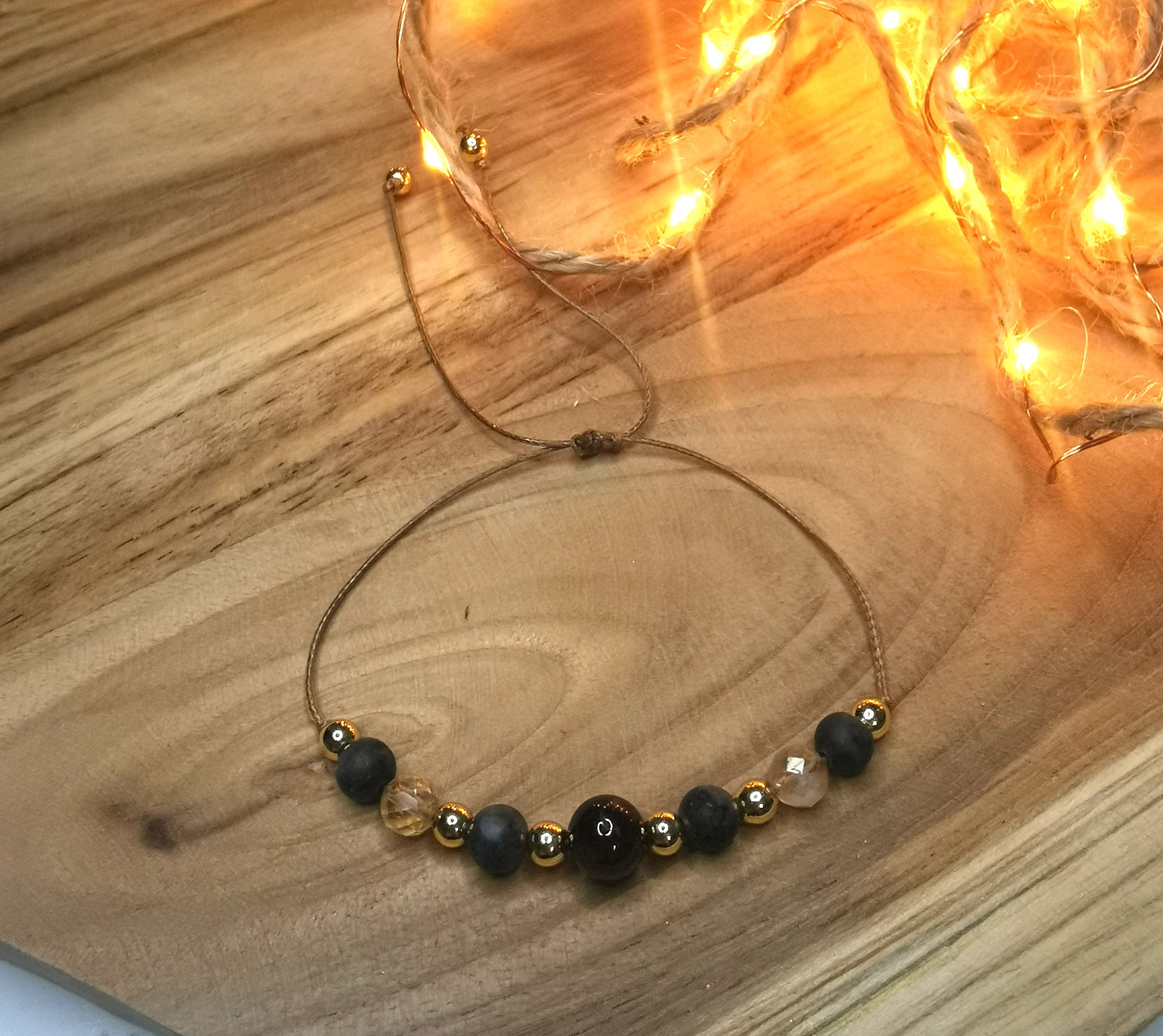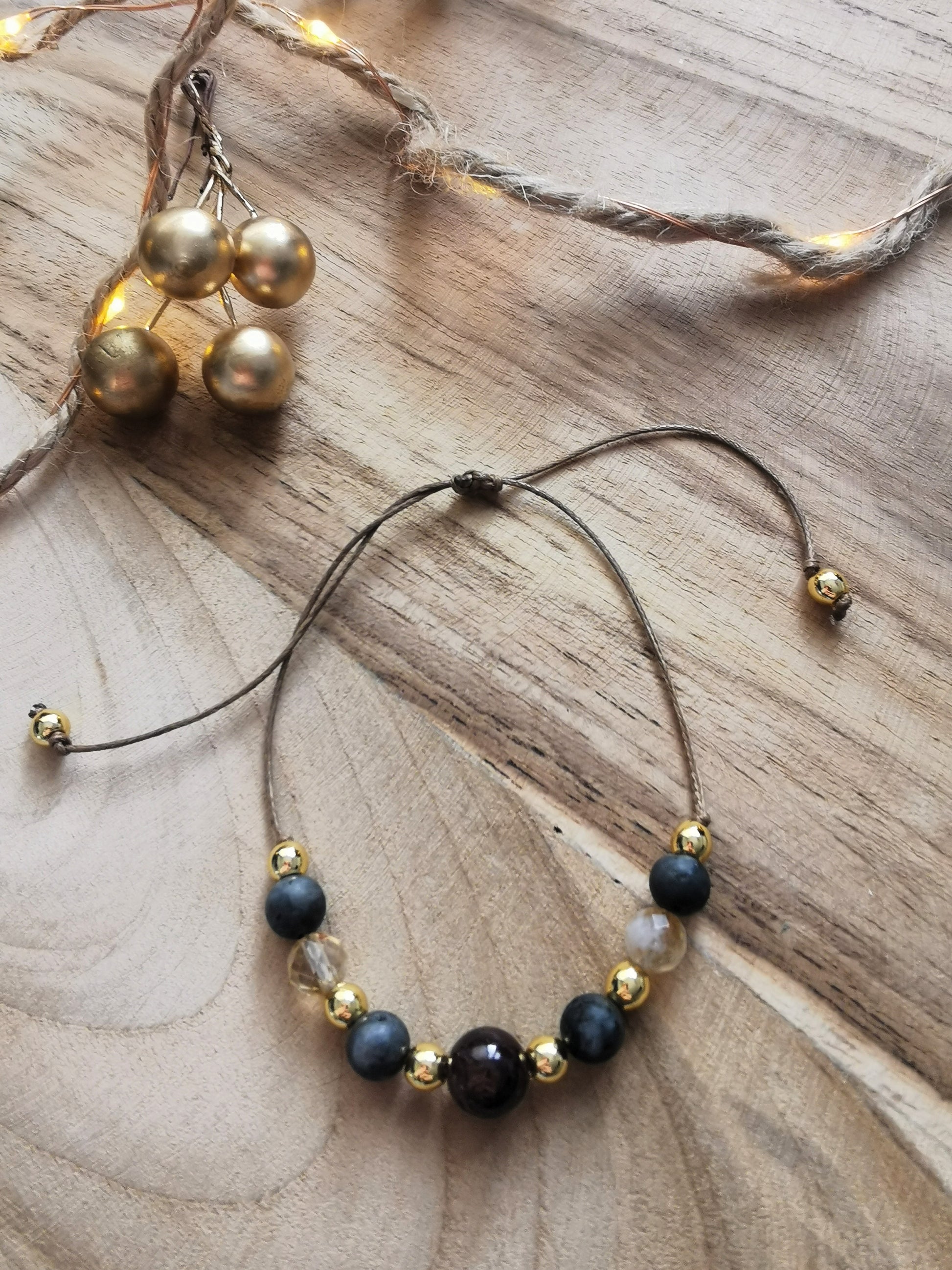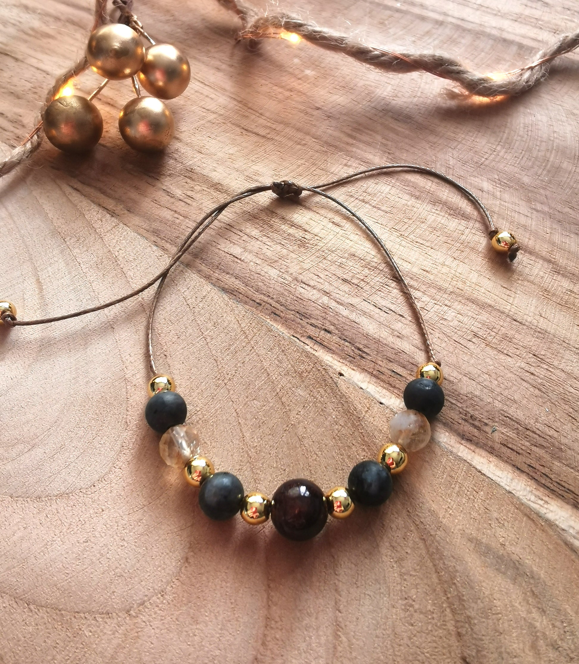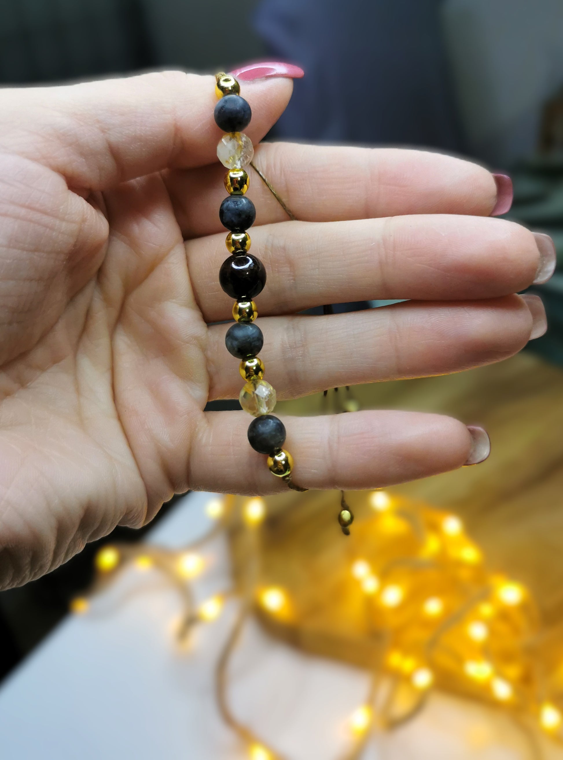 Ręcznie wykonana bransoletka na sznurku, stworzona z naturalnych kamieni o wyjątkowej energii – granatu, labradorytu, cytrynu i pozłacanego hematytu. Ciepłe, złociste refleksy i głębokie odcienie kamieni tworzą harmonijną, energetyczną kompozycję.