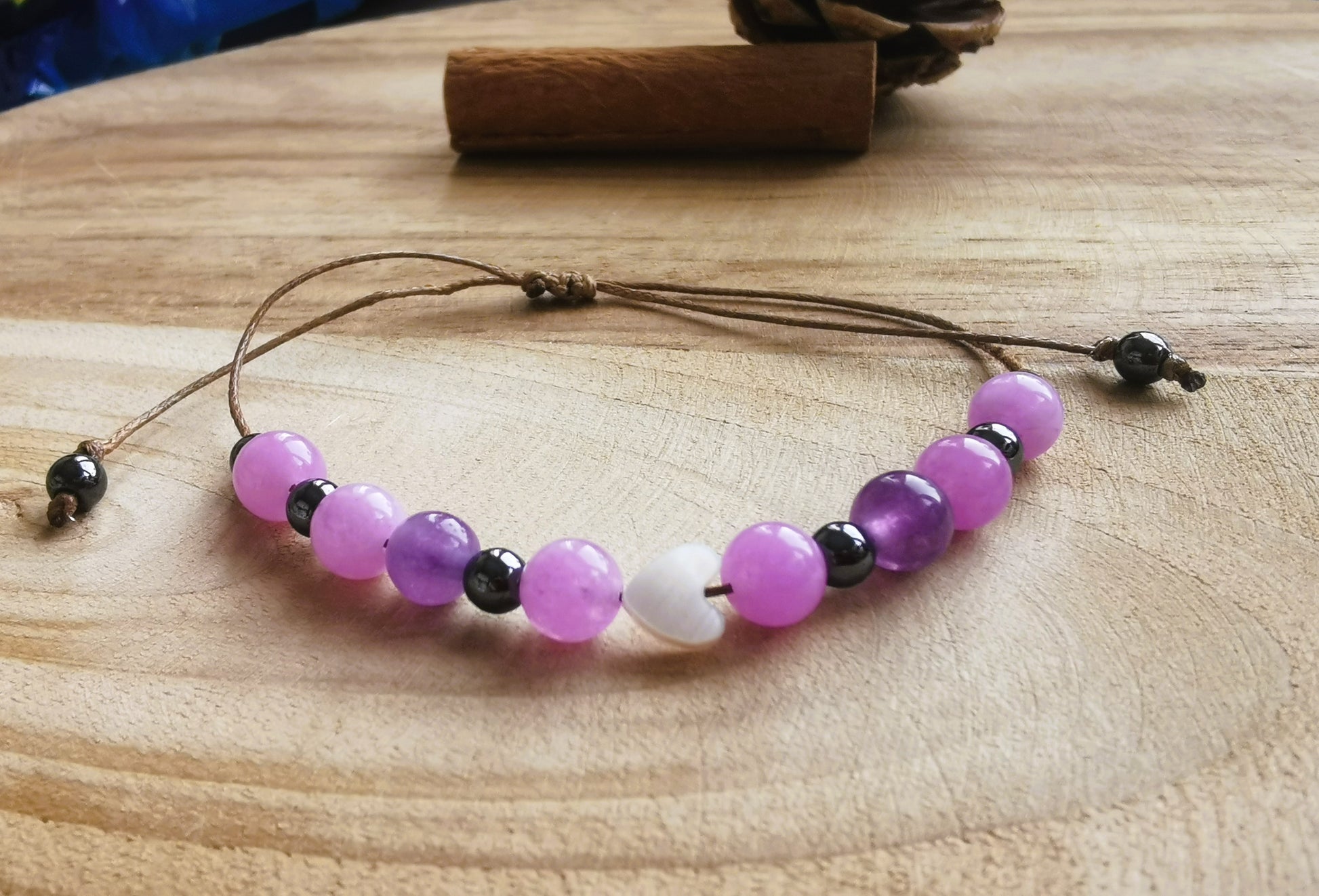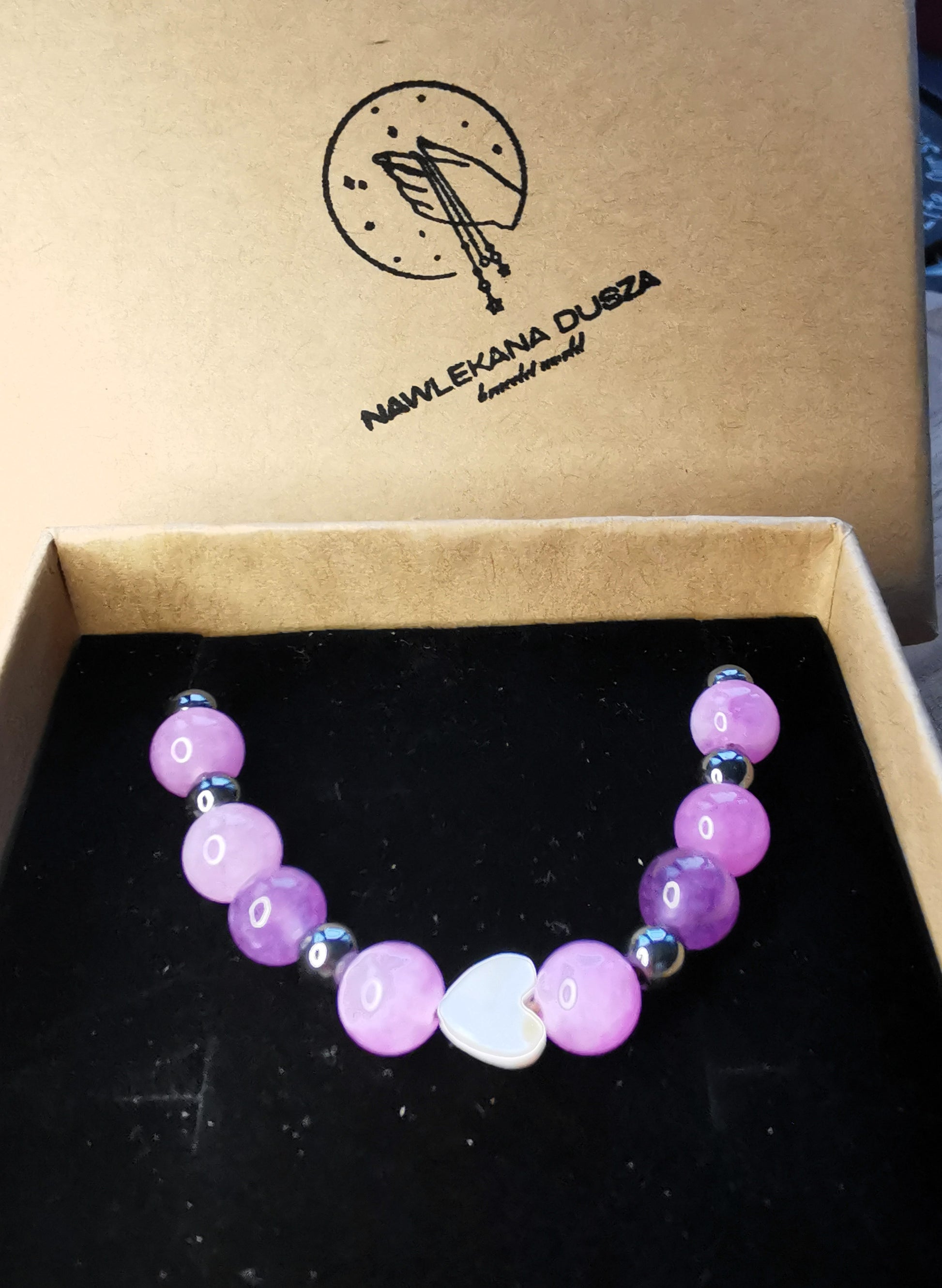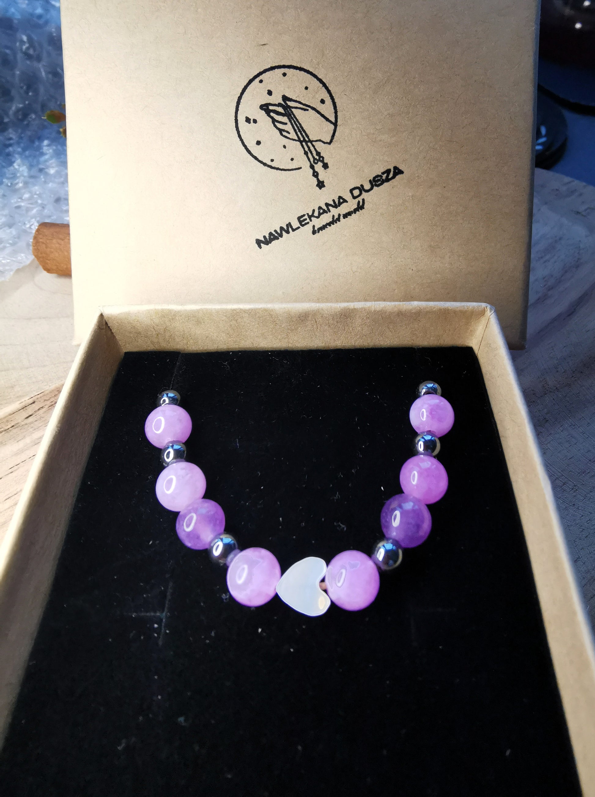 Subtelna, ręcznie wykonana bransoletka na sznurku, stworzona z naturalnych kamieni – anhydrytu, różowego jadeitu, masy perłowej w kształcie serca oraz hematytu. Połączenie pastelowych odcieni różu, fioletu i bieli emanuje spokojem, delikatnością i kobiecą energią.