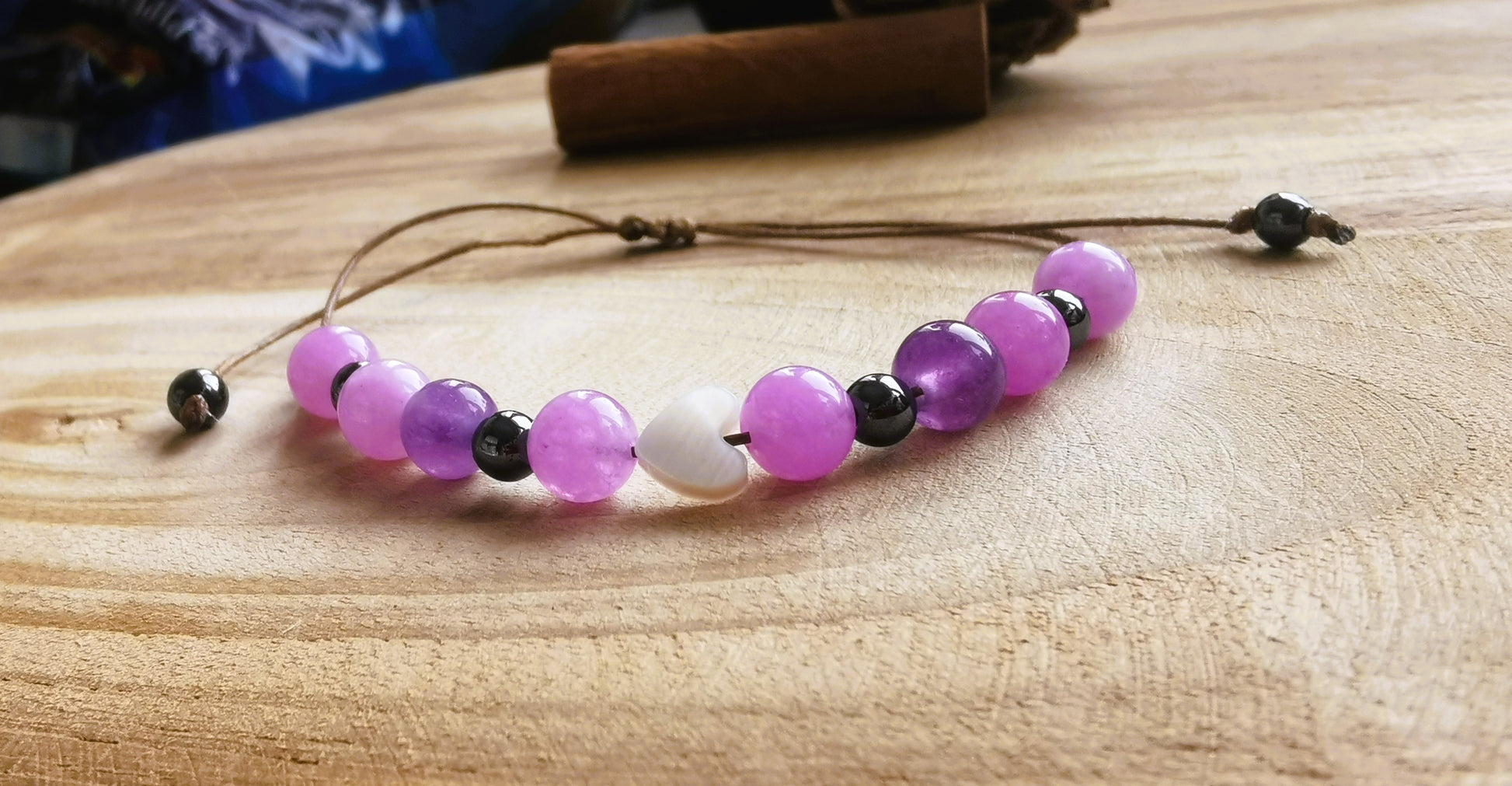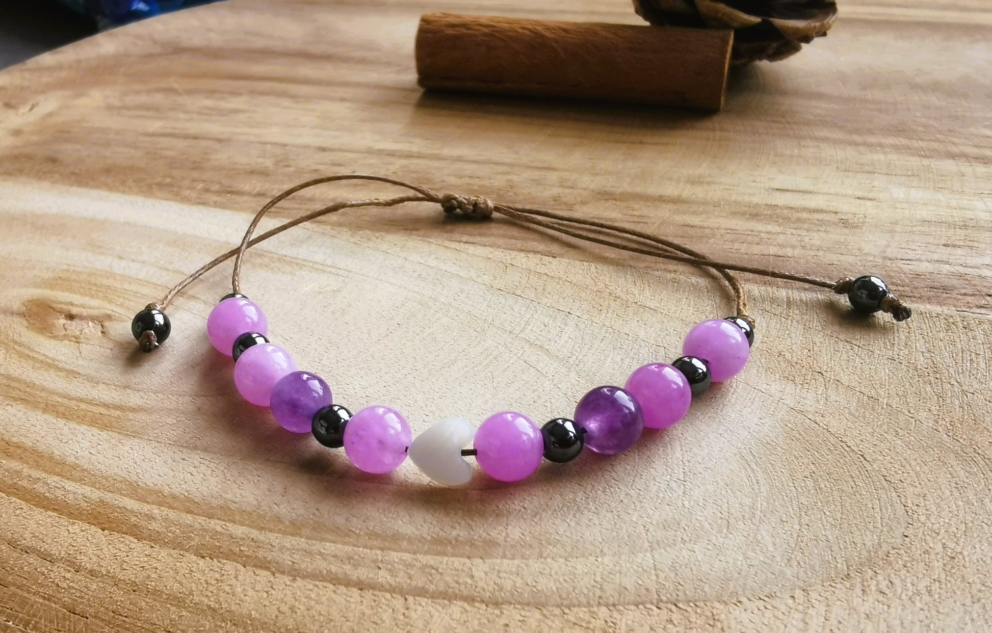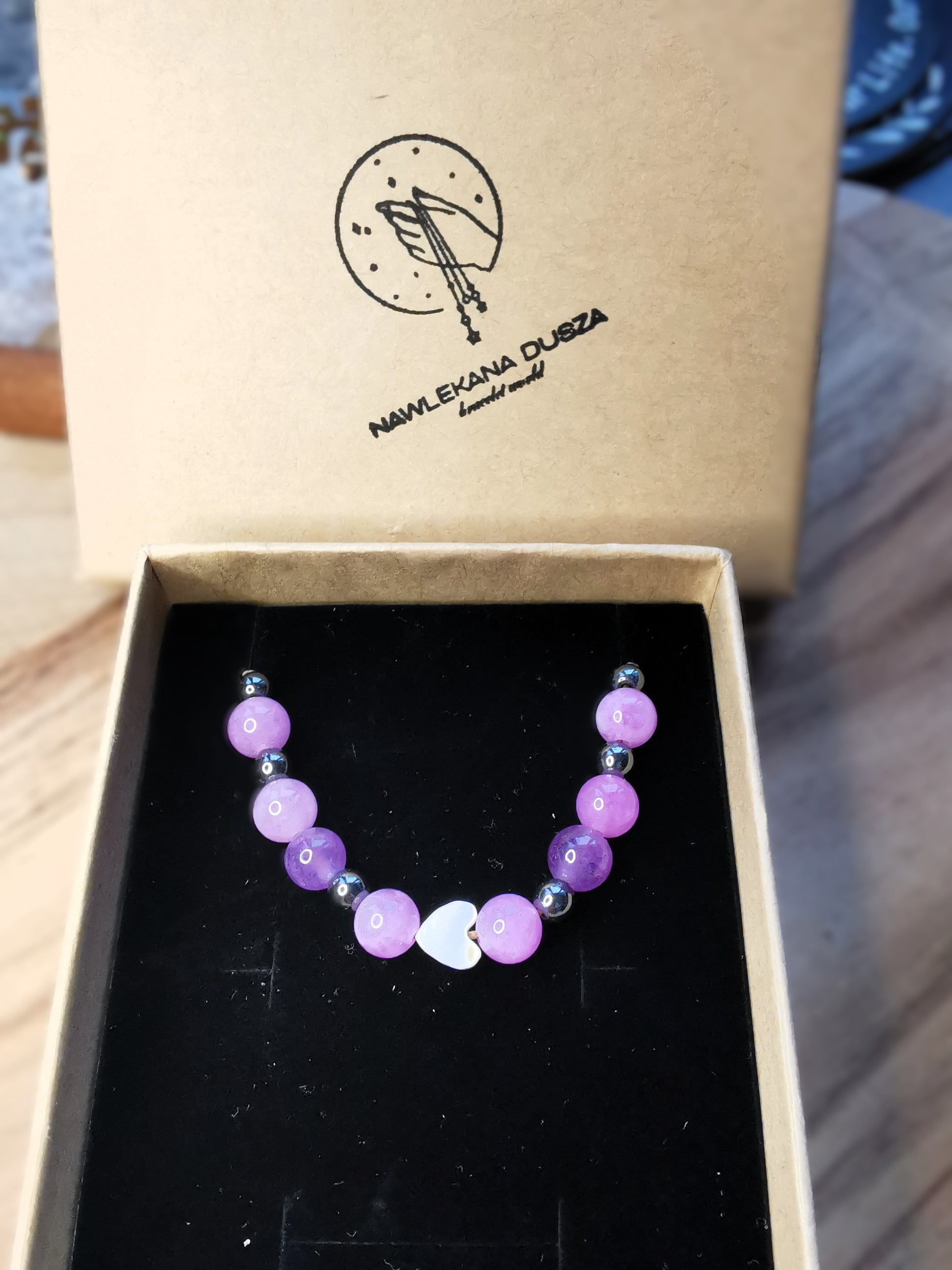 Subtelna, ręcznie wykonana bransoletka na sznurku, stworzona z naturalnych kamieni – anhydrytu, różowego jadeitu, masy perłowej w kształcie serca oraz hematytu. Połączenie pastelowych odcieni różu, fioletu i bieli emanuje spokojem, delikatnością i kobiecą energią.