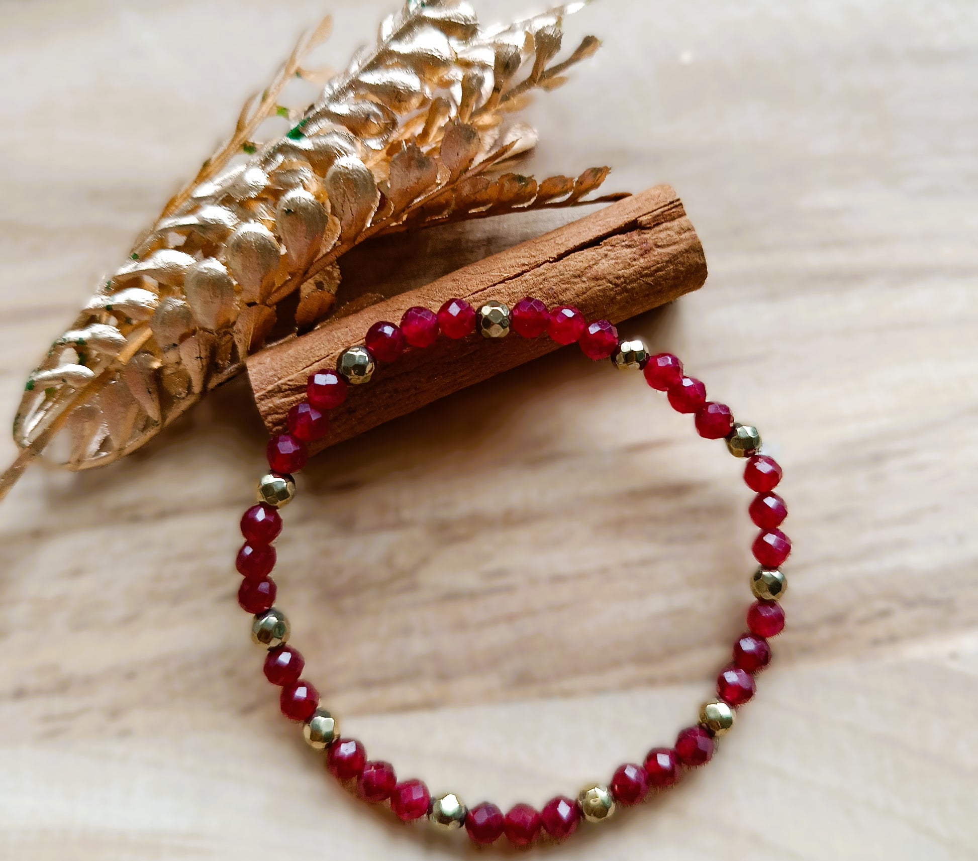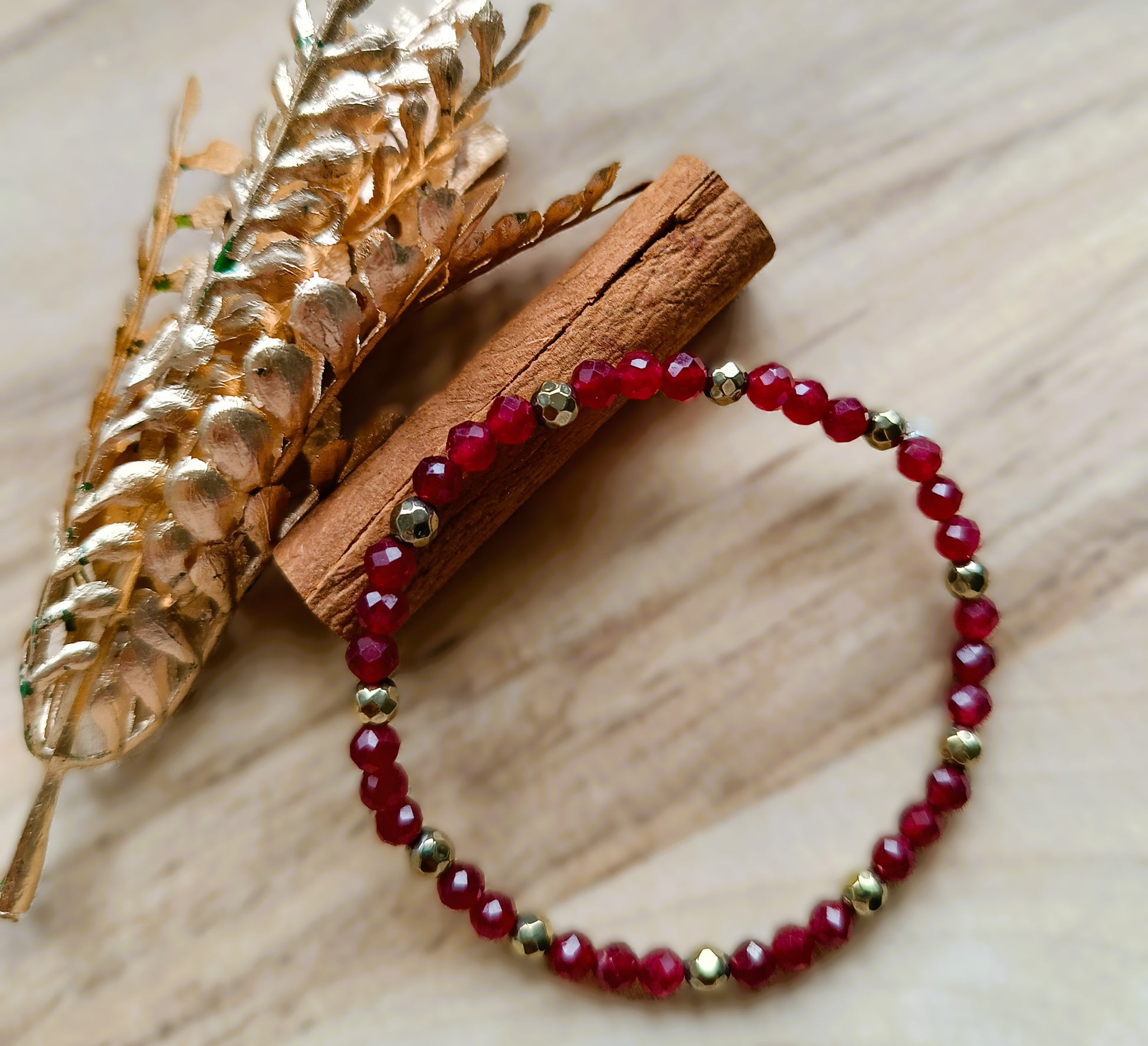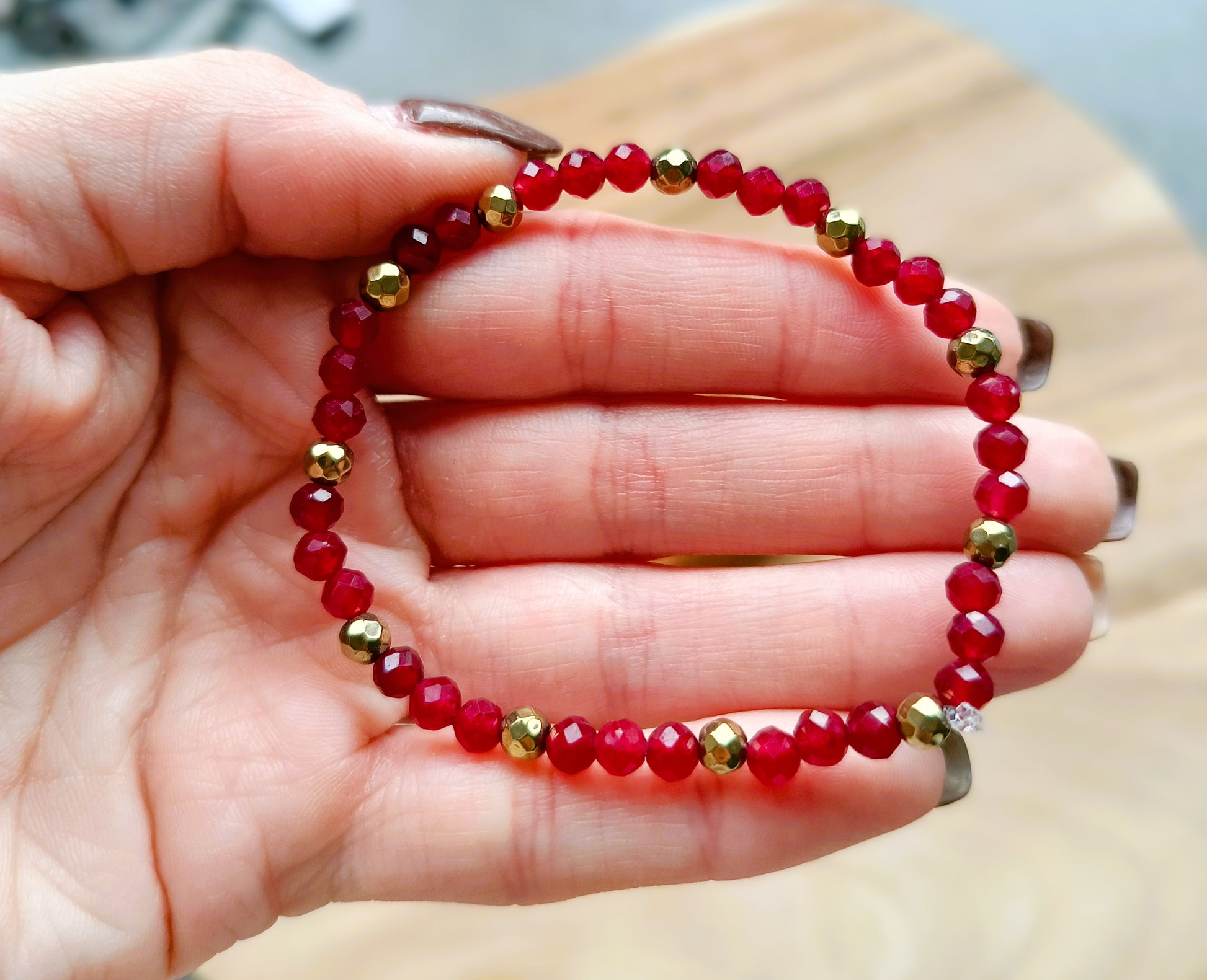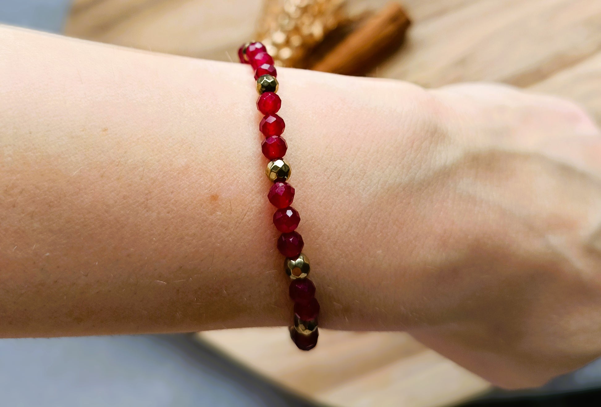 Elegancka i energetyczna bransoletka z chalcedonu czerwonego i hematytu, wykonana na trwałej lince jubilerskiej. Połączenie ognistej czerwieni z połyskiem złotego hematytu tworzy wyjątkową biżuterię, która dodaje odwagi, energii i pewności siebie.