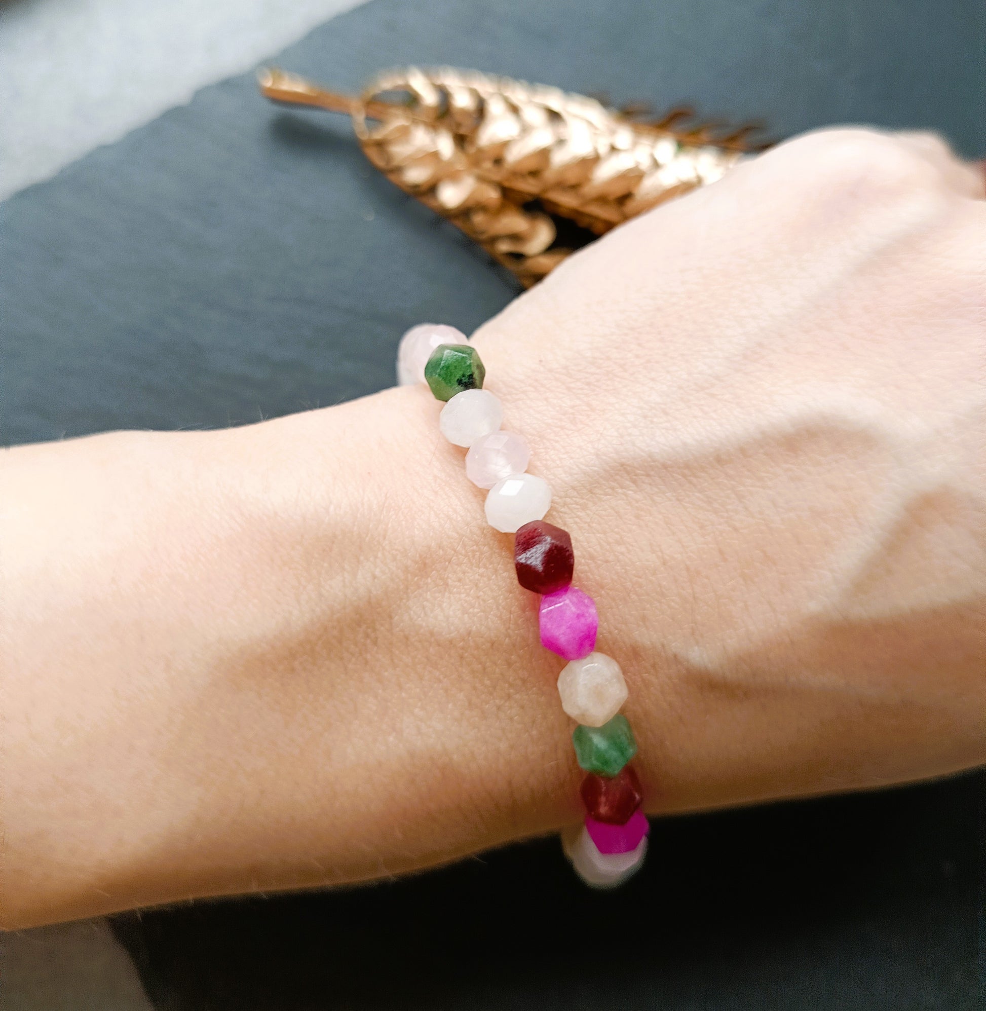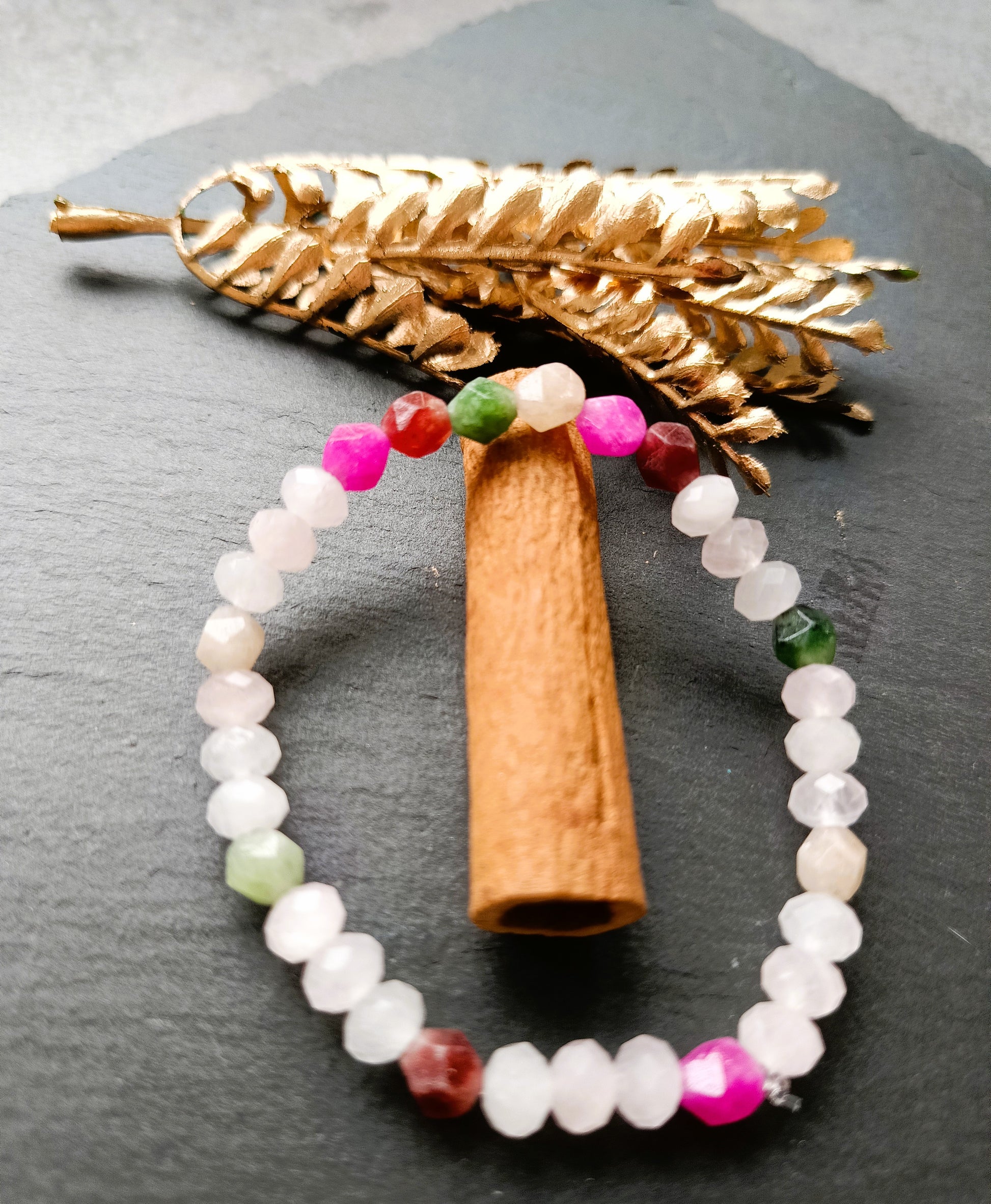 Pełna subtelności i pozytywnej energii bransoletka z turmalinu i kwarcu różowego, wykonana na trwałej lince jubilerskiej. Kolory natury — róż, zieleń, bordo i biel — tworzą delikatną, kobiecą kompozycję, która łączy miłość, ochronę i spokój.