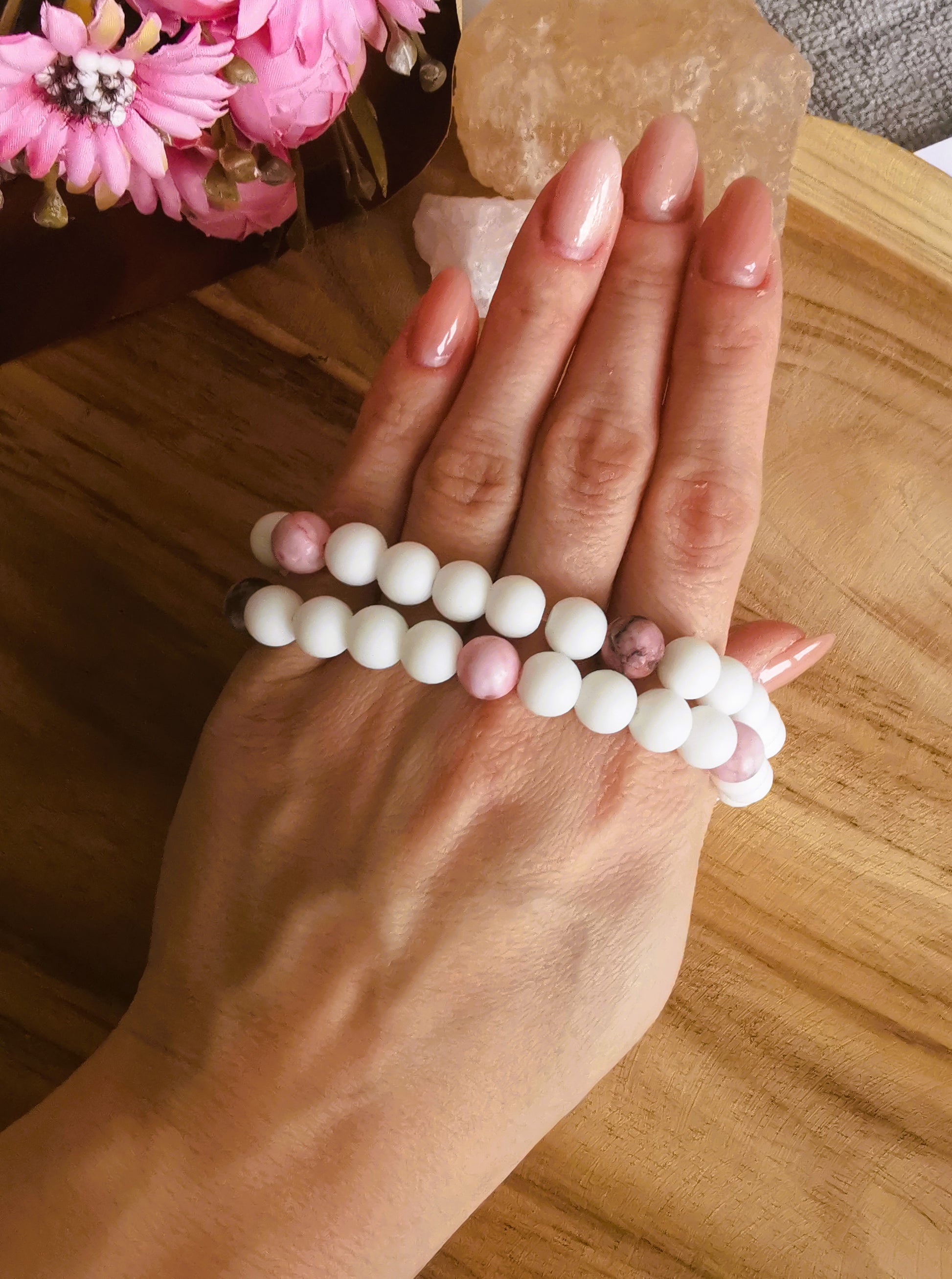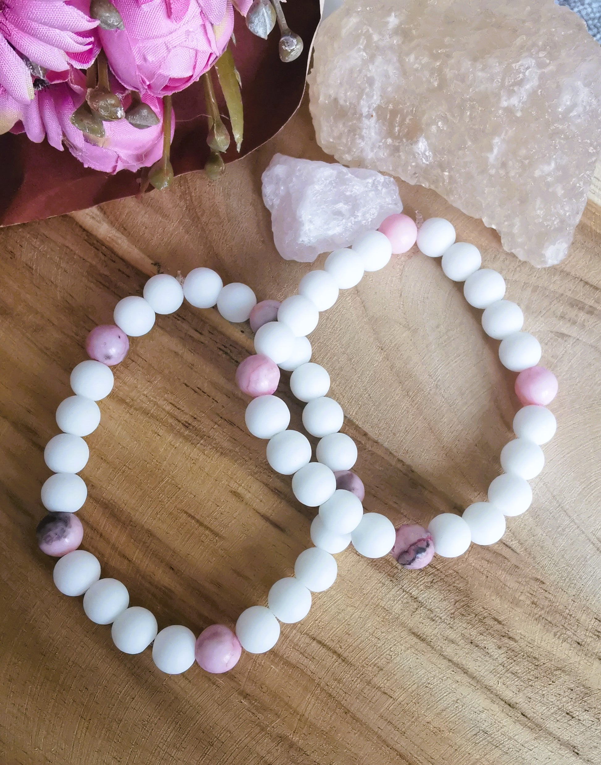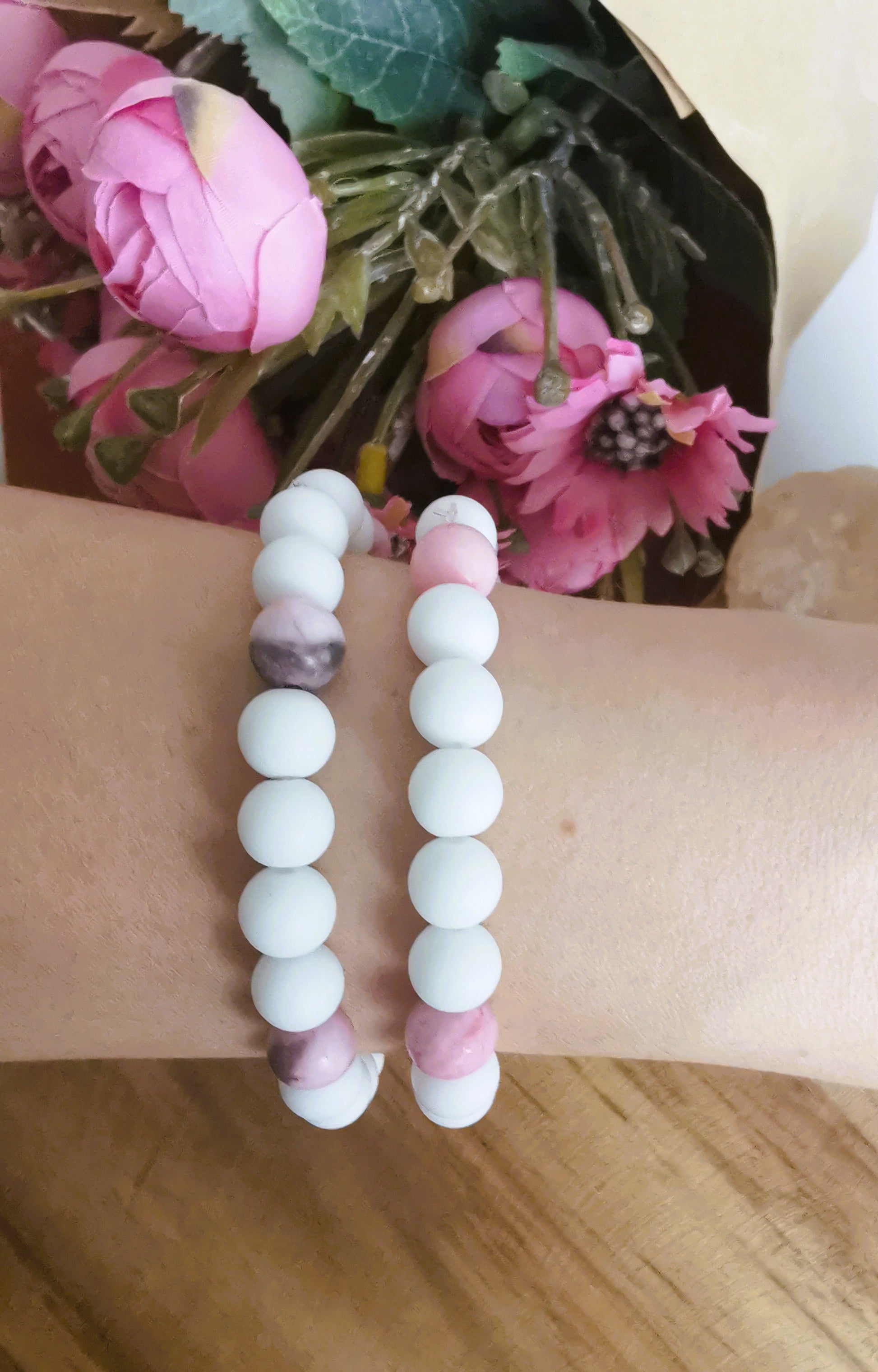 Subtelna bransoletka łącząca różowy i biały howlit — symbole spokoju, harmonii i delikatnych emocji.