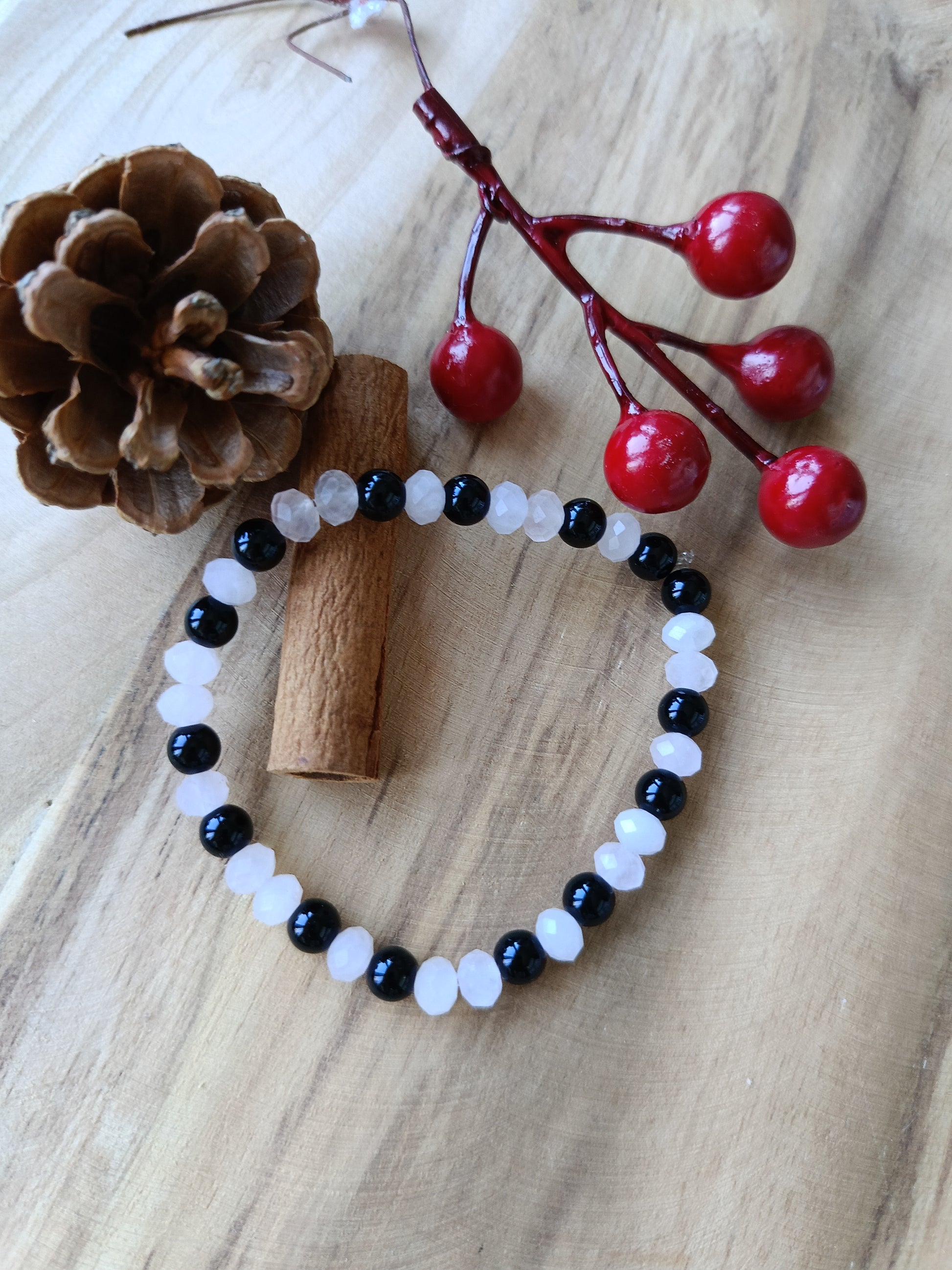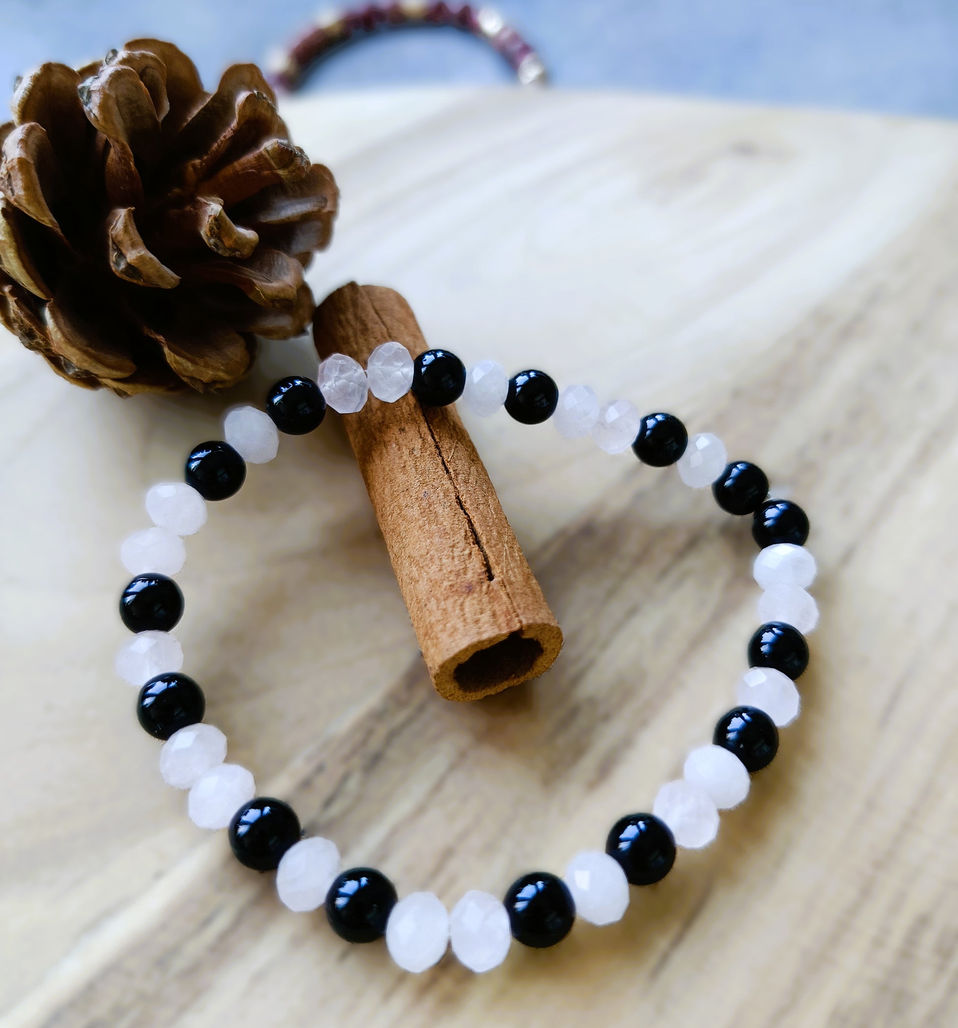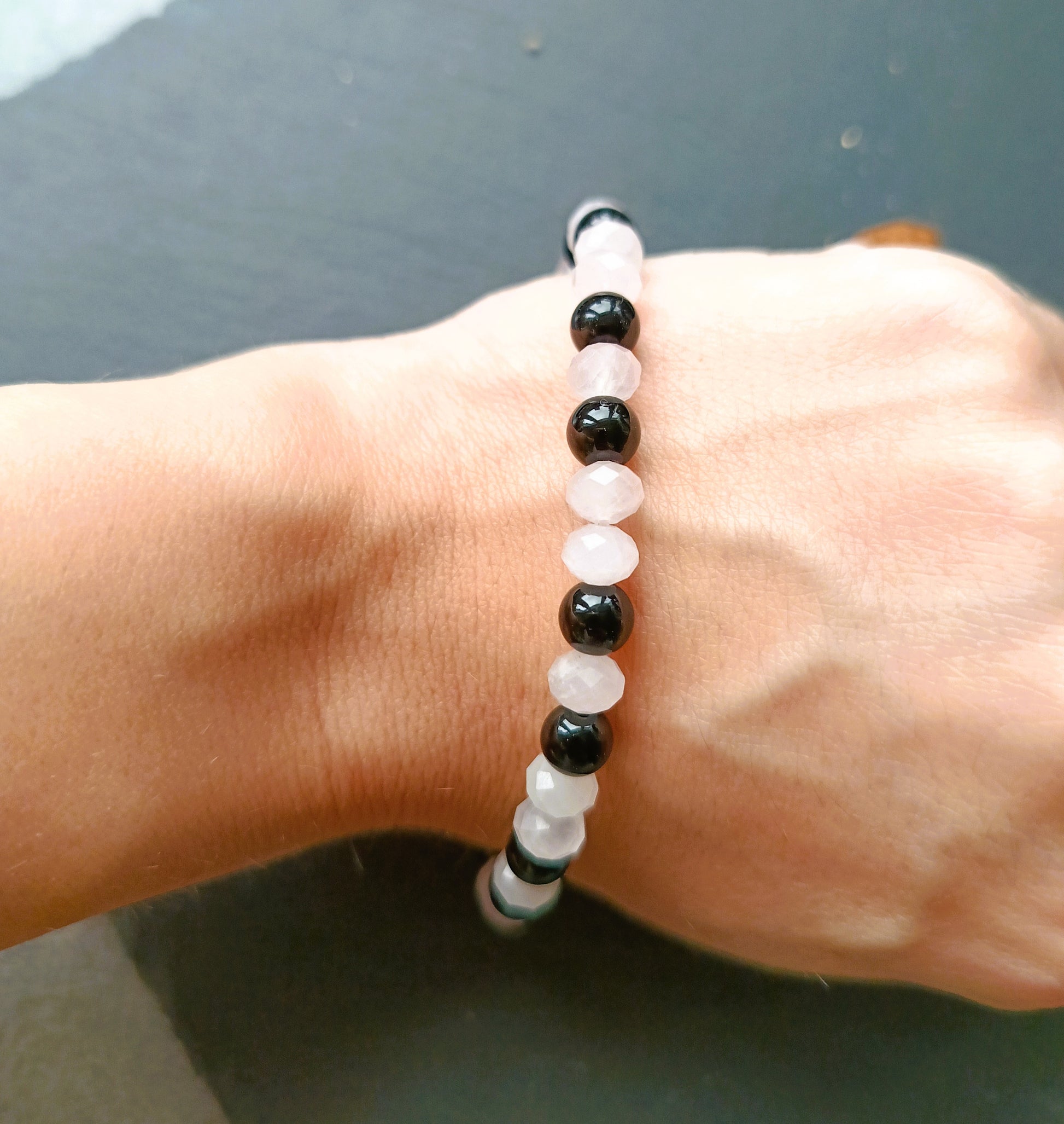 Delikatna, a zarazem pełna mocy bransoletka wykonana z naturalnych kamieni – kwarcu różowego i onyksu – nawleczonych na wytrzymałą linkę jubilerską.