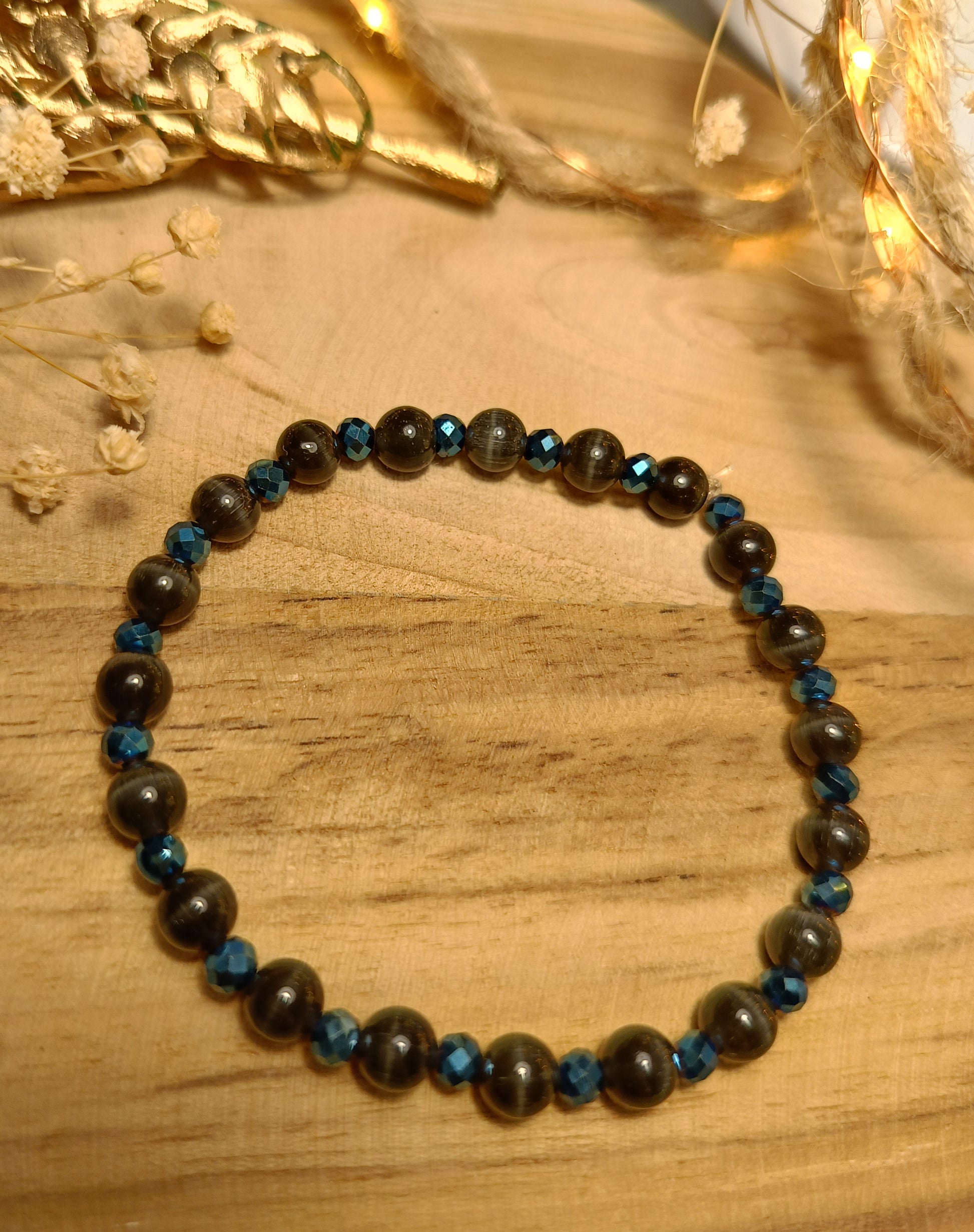 Odkryj siłę ochrony i wewnętrznej równowagi z elegancką bransoletką "Moc Intuicji". Wykonana z naturalnych kamieni – kociego oka i hematytu – ta 17-centymetrowa bransoletka nie tylko przyciąga wzrok swoim blaskiem, ale także niesie ze sobą głębsze znaczenie.