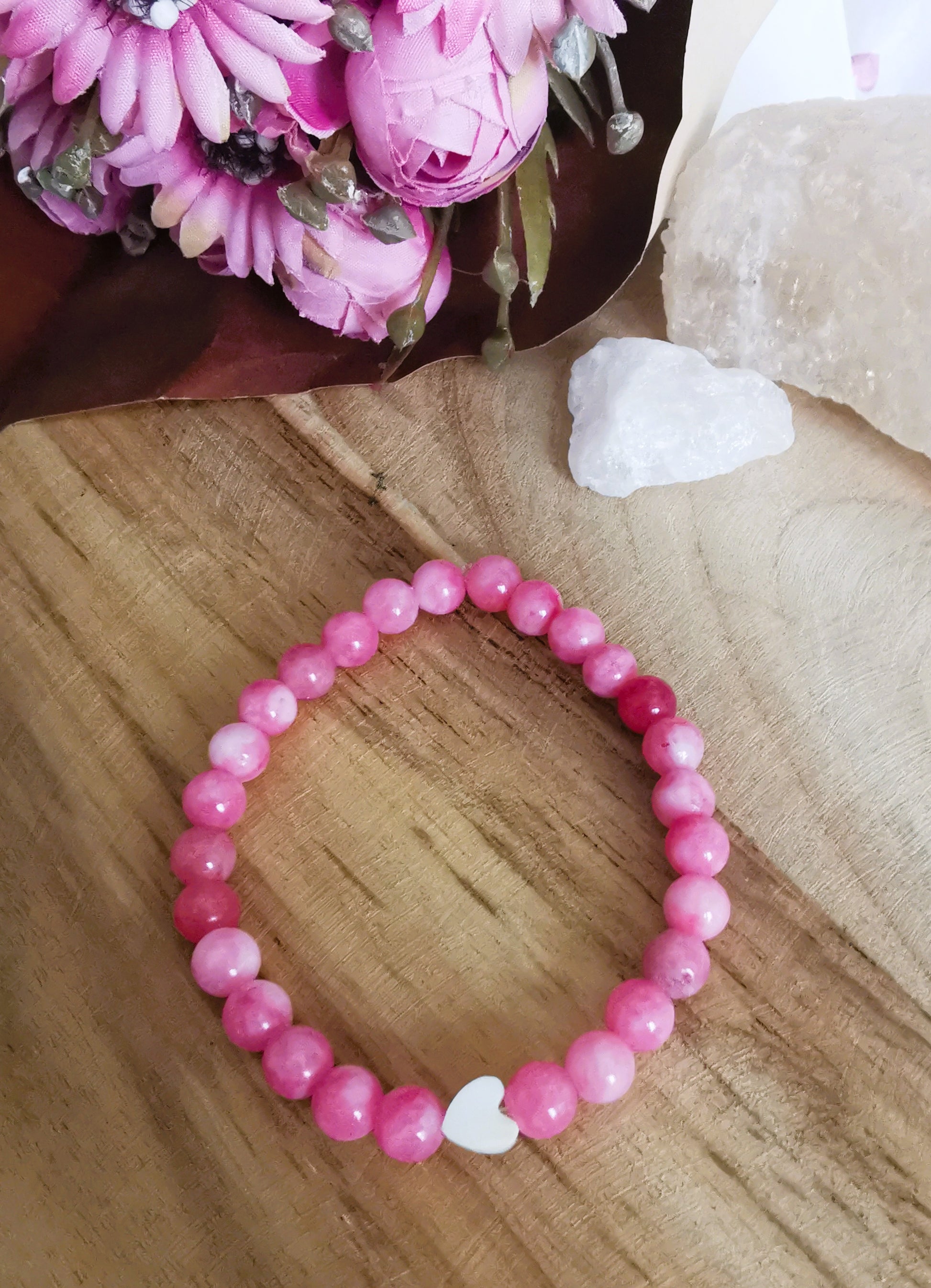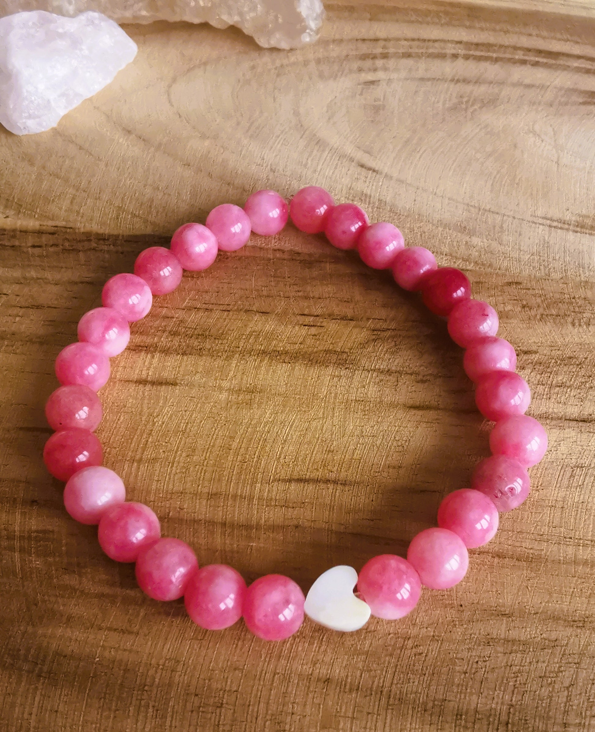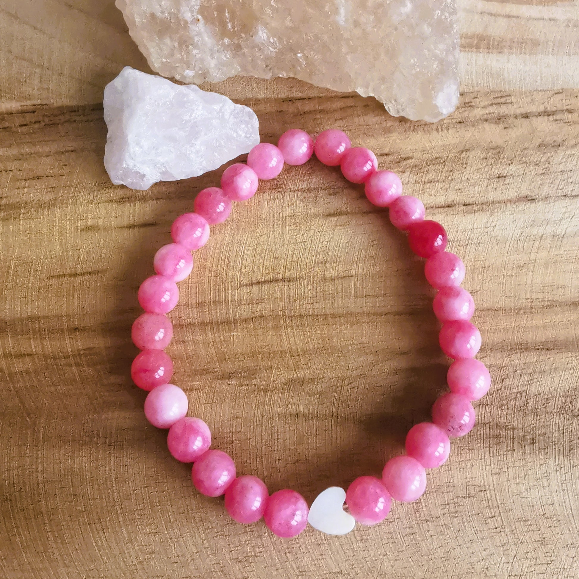 Rodochrozyt wspiera otwartość serca i relacje, a masa perłowa dodaje delikatności i lekkości.