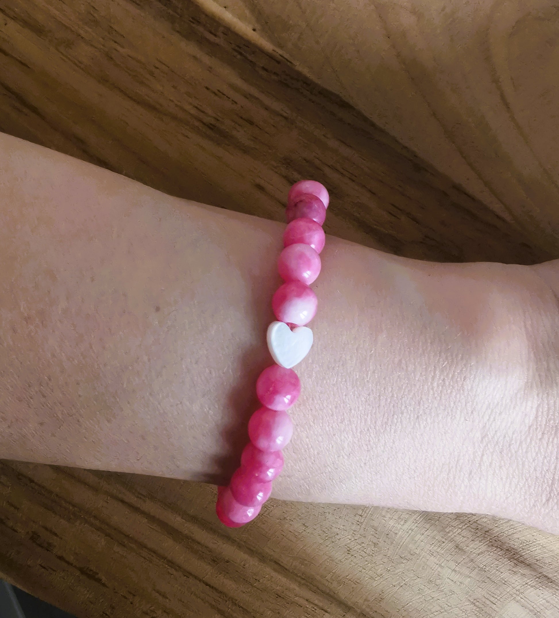 Bransoletka z rodochrozytu i masy perłowej w kształcie serca — symbolu miłości, emocji i bliskości.