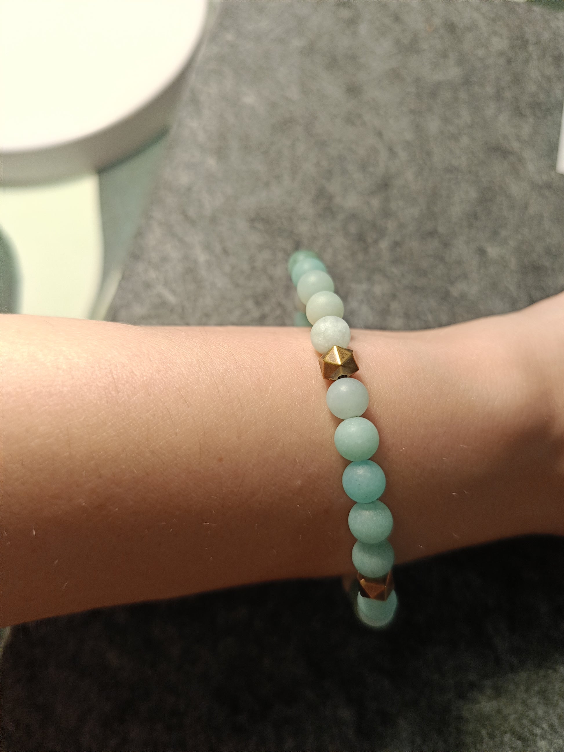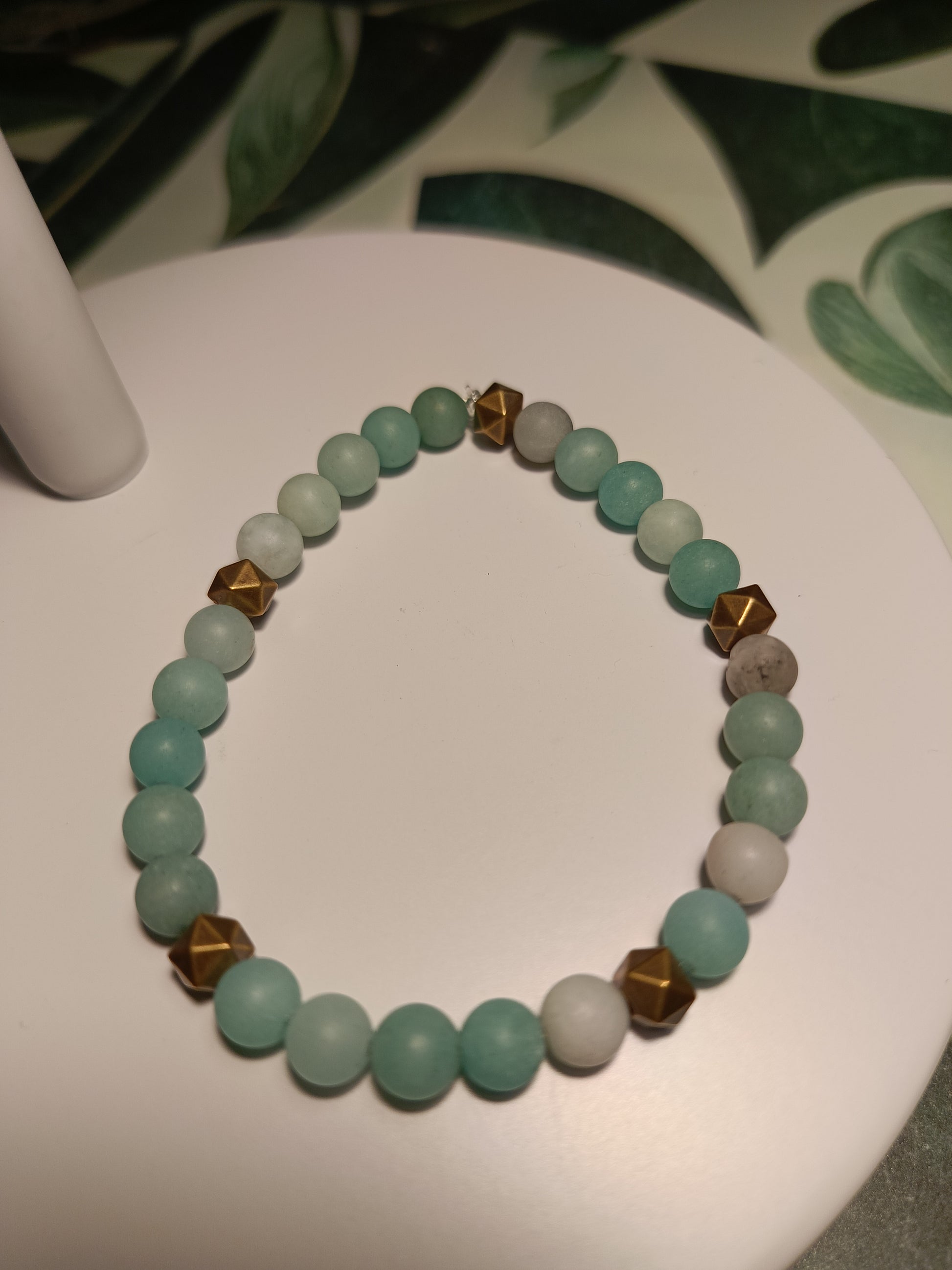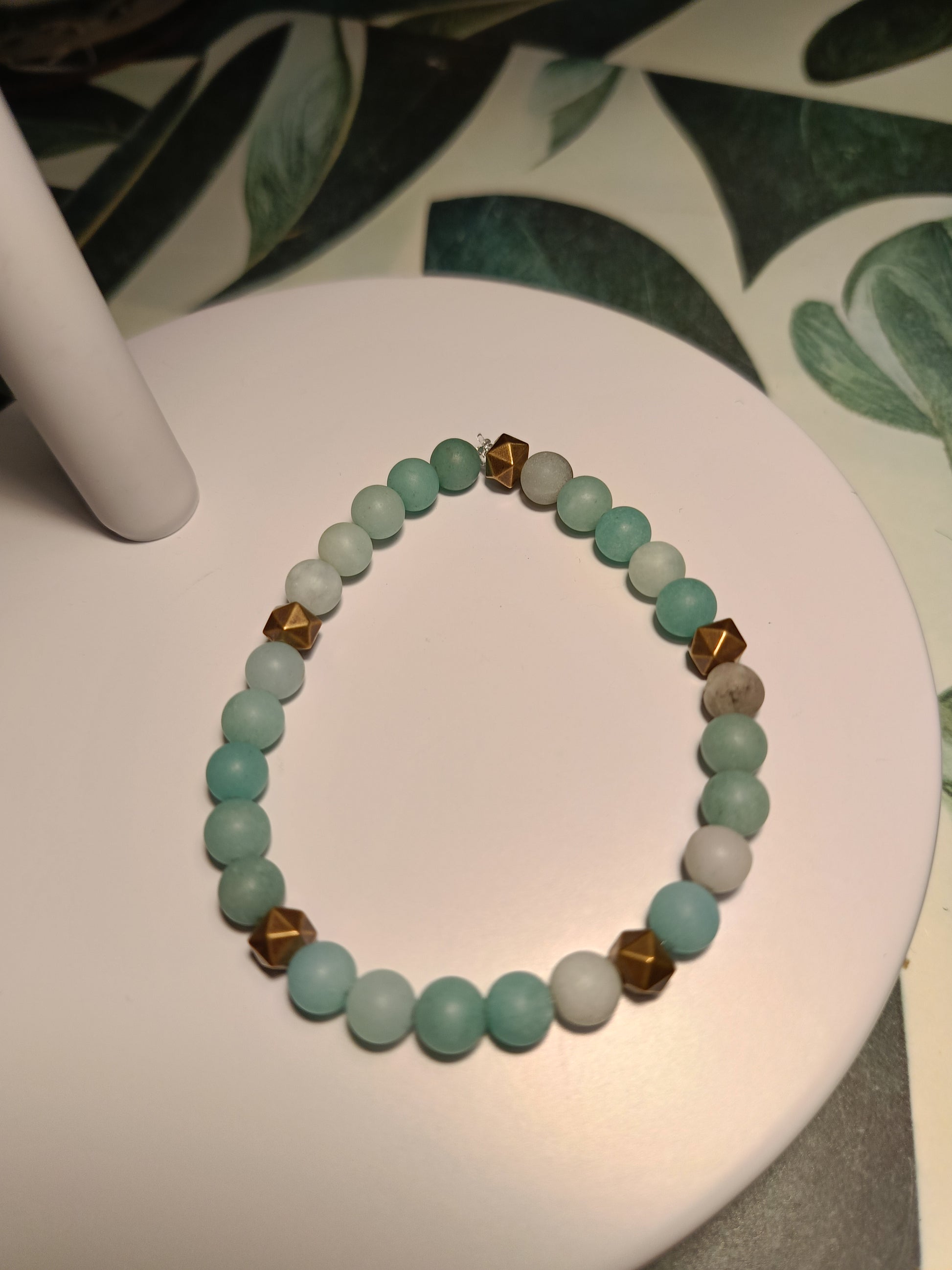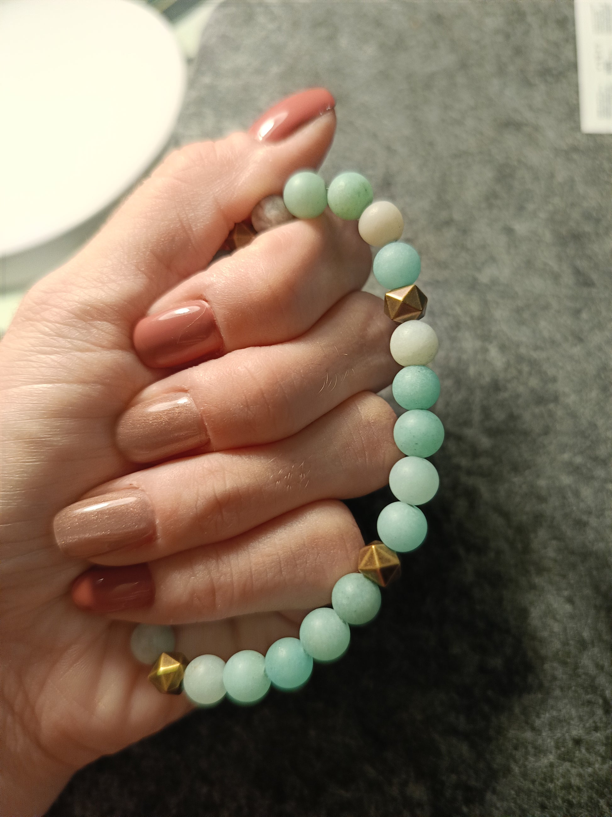 Delikatna, a jednocześnie pełna energii bransoletka z naturalnego amazonitu, wykonana ręcznie z dbałością o każdy detal. Jej miękkie odcienie zieleni, błękitu i beżu symbolizują harmonię z naturą oraz wewnętrzny spokój. Złote przekładki dodają całości elegancji i subtelnego blasku.