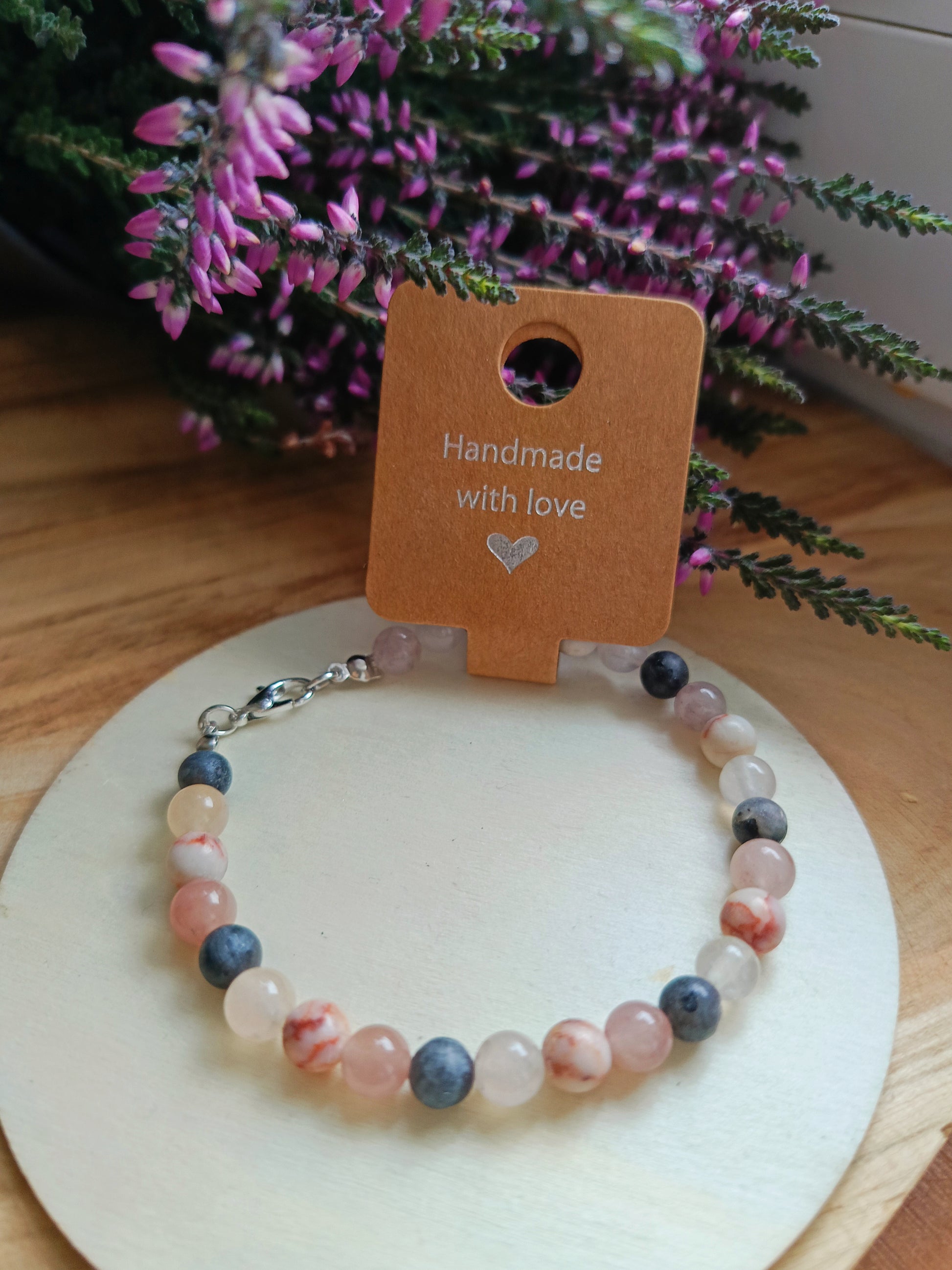 Subtelna i pełna harmonii bransoletka z naturalnych kamieni, wykonana na trwałej lince jubilerskiej z eleganckim zapięciem. Jej delikatne odcienie różu, szarości i kremu wprowadzają atmosferę spokoju i wyciszenia. To biżuteria, która przypomina o sile ciszy, cierpliwości i równowagi.