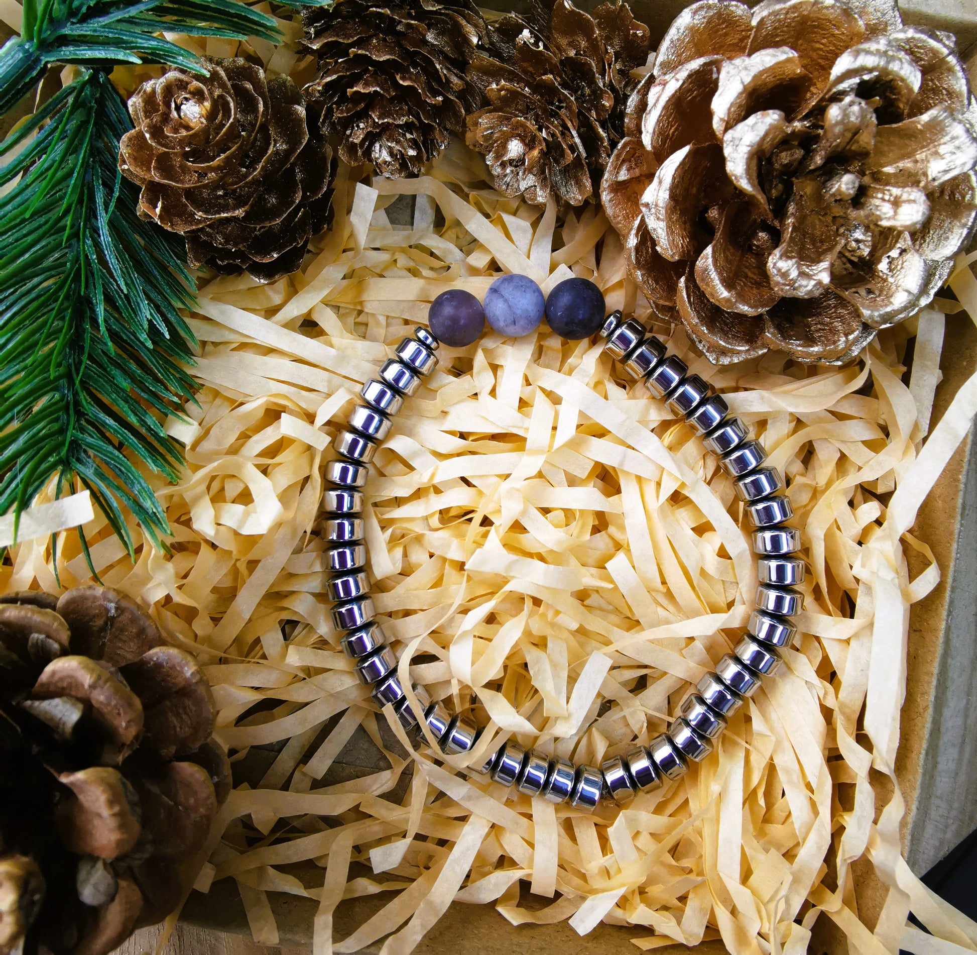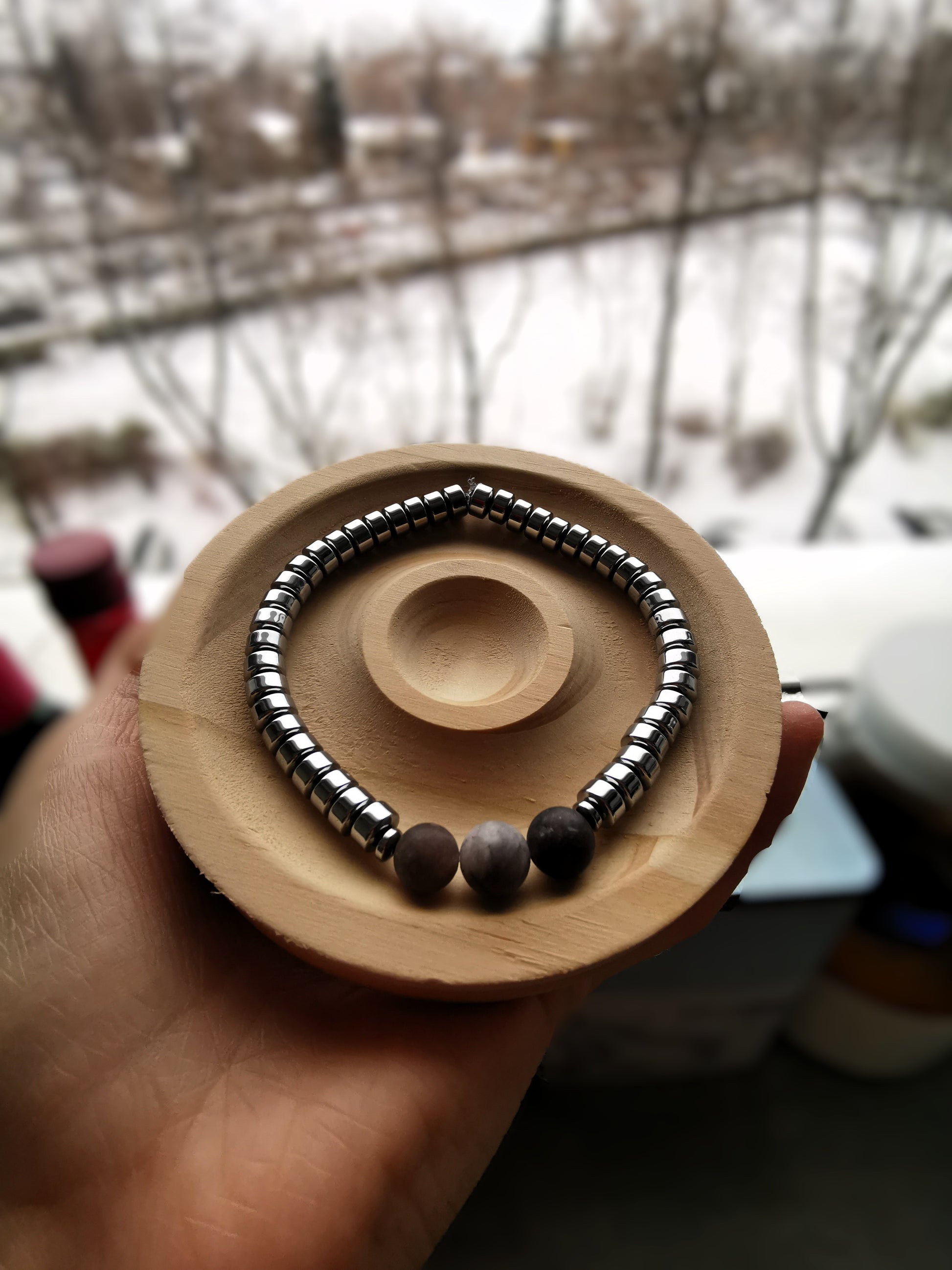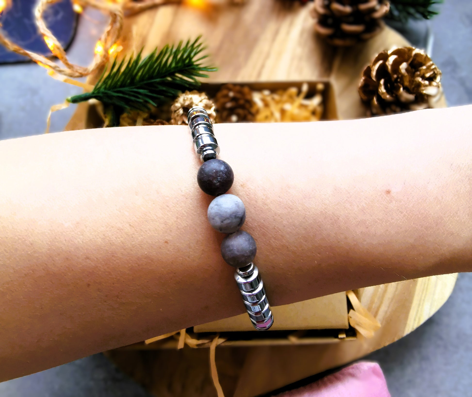 - Szary agat wnosi stabilność, opanowanie i pewność siebie, a hematyt dodaje metalicznej, męskiej energii i eleganckiego charakteru.
