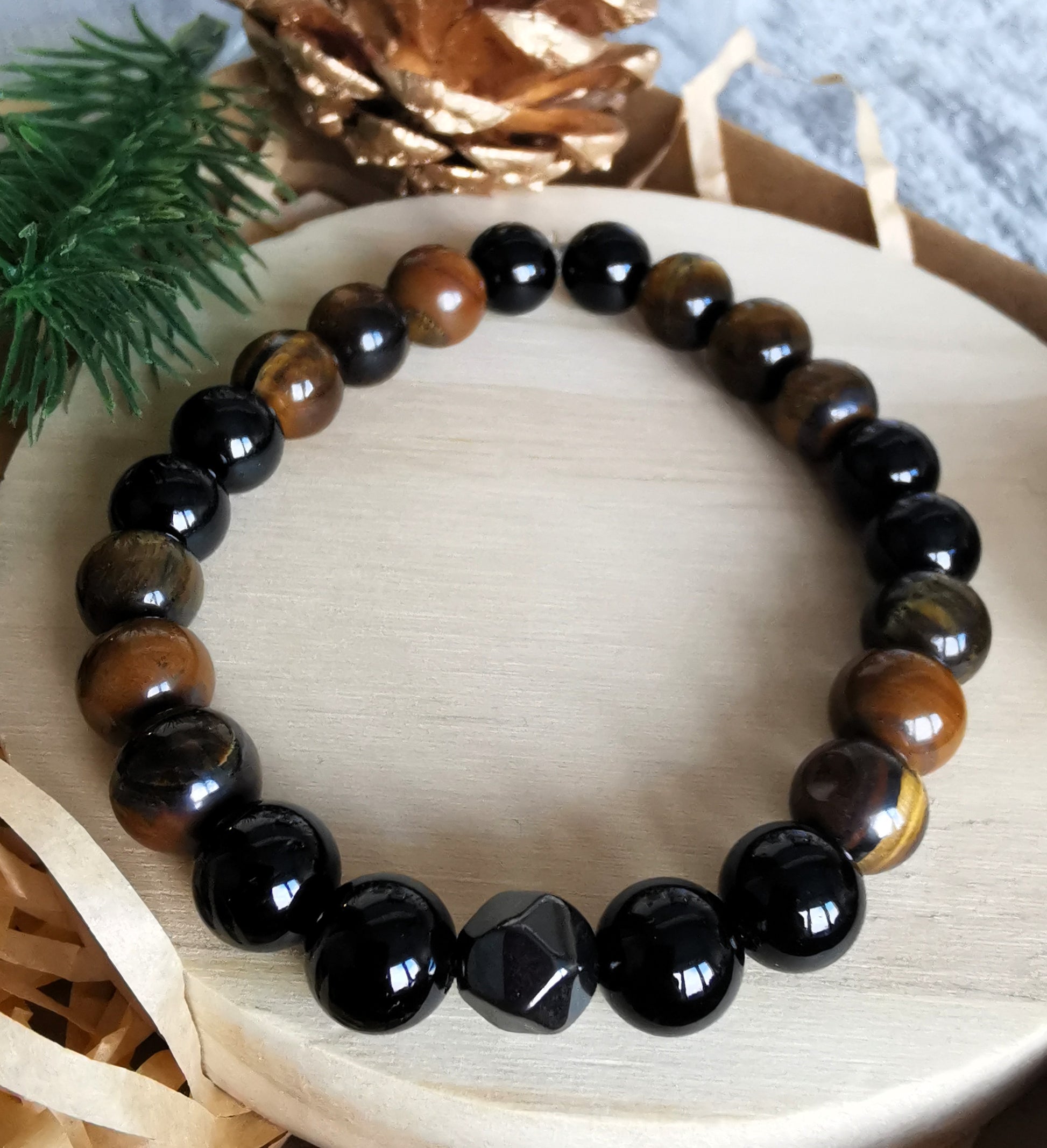 🧿 Męska bransoletka z tygrysiego oka, turmalinu i hematytu •
