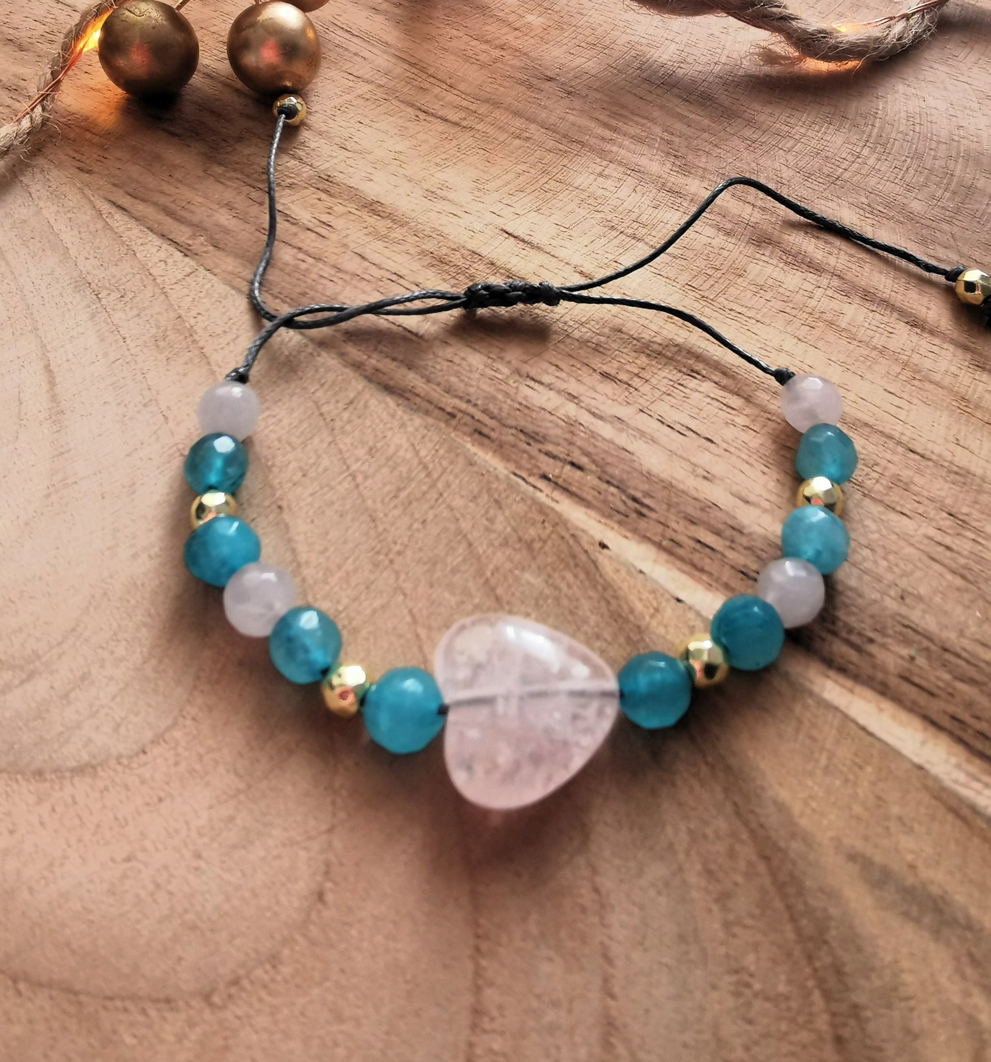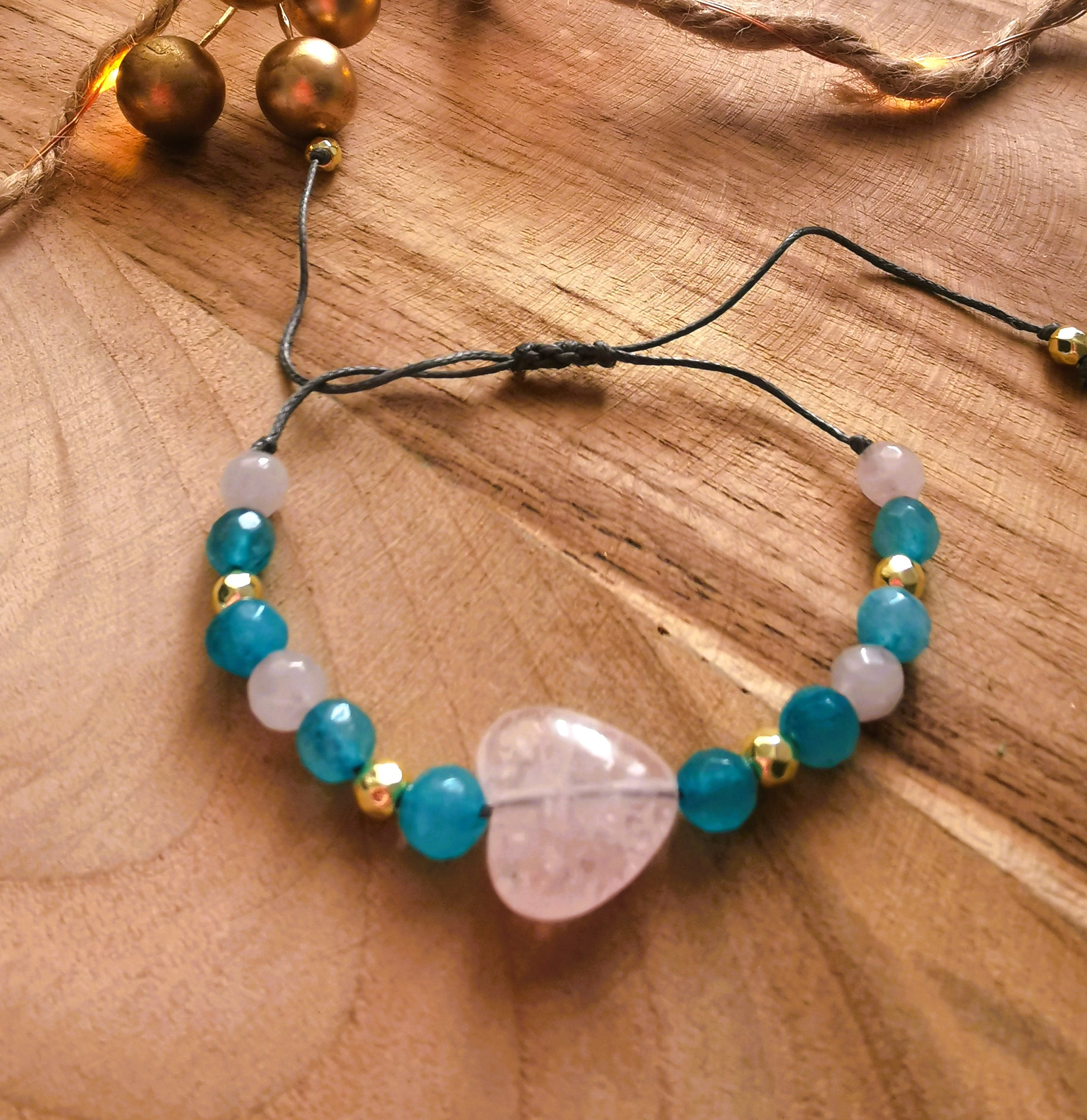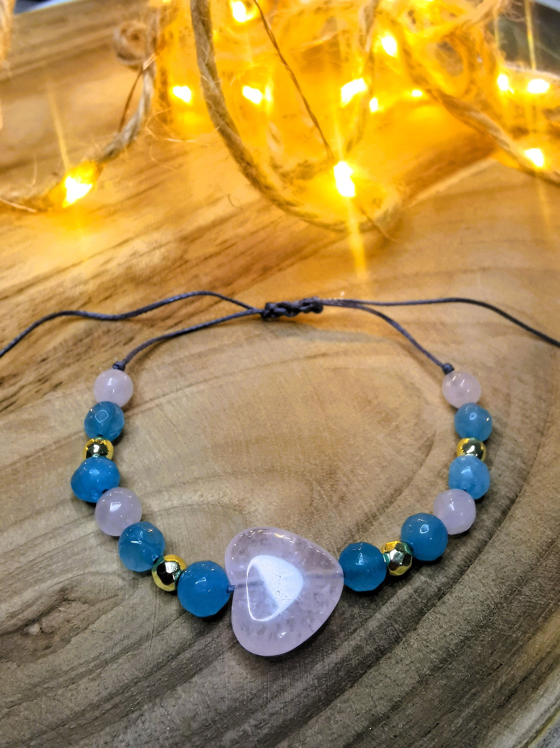 Subtelna bransoletka na sznurku, wykonana ręcznie z naturalnych kamieni – różowego kwarcu w kształcie serca, niebieskiego chalcedonu o spokojnej, pastelowej barwie oraz pozłacanego hematytu, który dodaje całości elegancji i blasku.