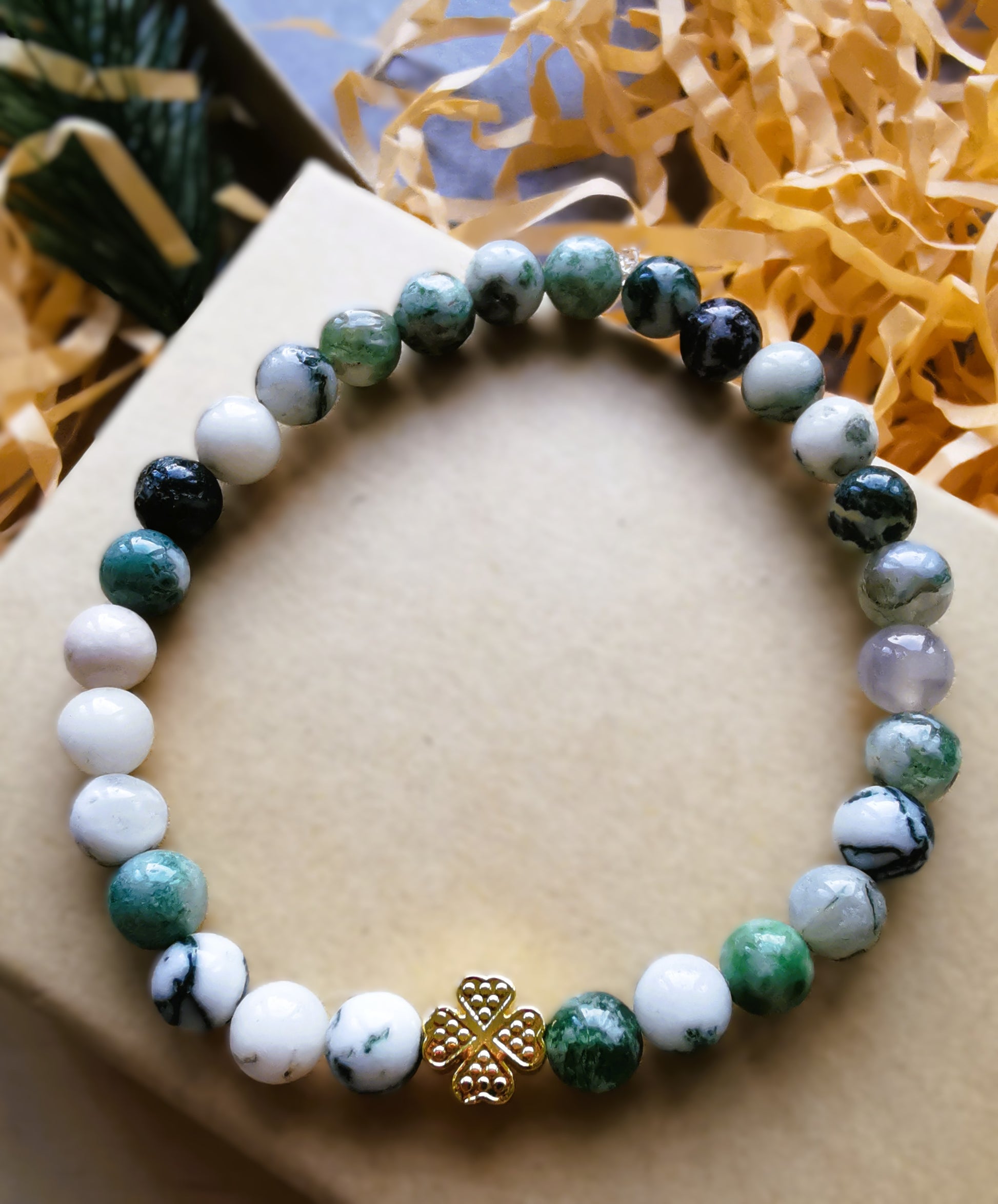 Delikatna bransoletka z agatu mszystego, który wspiera spokój i równowagę emocjonalną. Jego zielone odcienie symbolizują kontakt z naturą, a pozłacana koniczynka dodaje blasku i przyciąga szczęście.