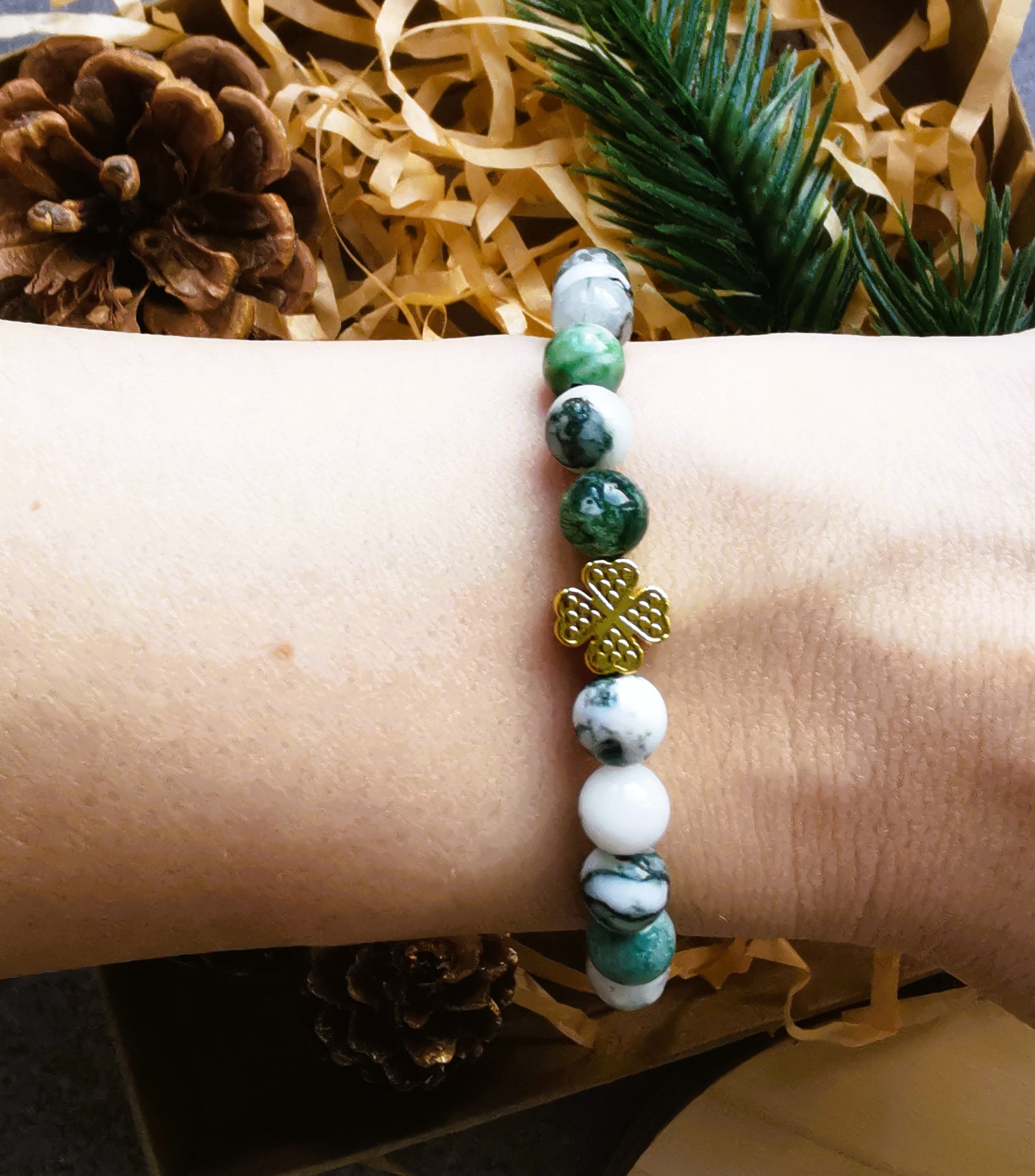 Damska bransoletka z agatu mszystego i pozłacaną koniczynką